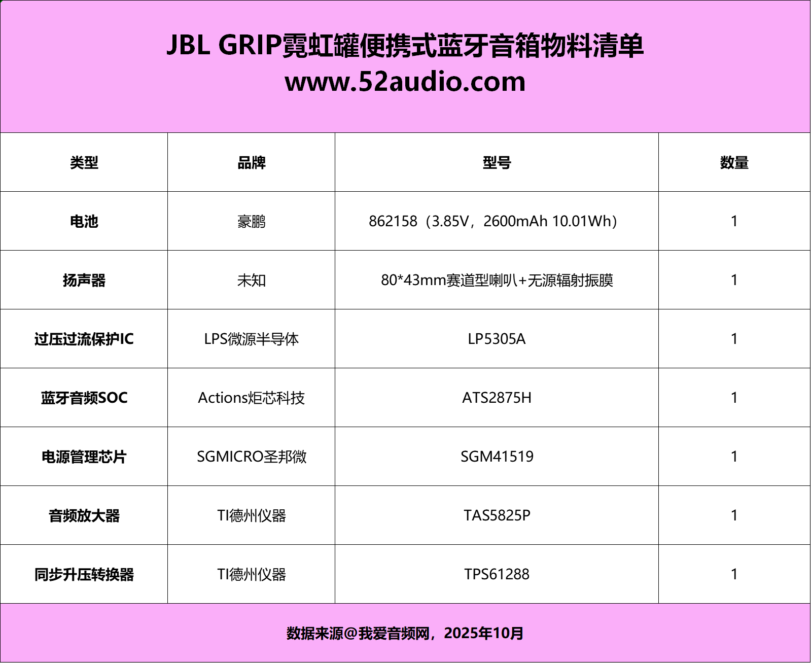 最后附上JBL GRIP霓虹罐便携式蓝牙音箱已知的物料清单,方便大家查阅。
