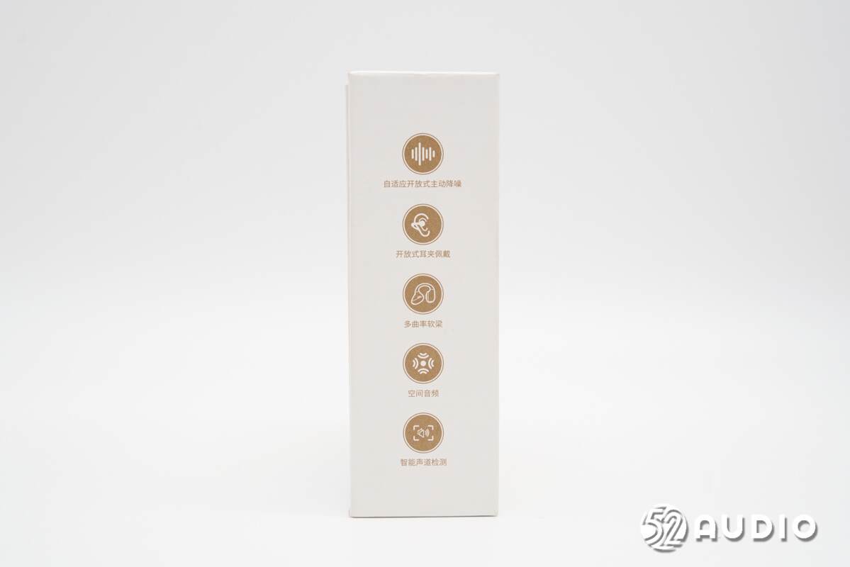 包装盒侧边展示的产品特点:自适应开放式主动降噪、开放式耳夹佩戴、多曲率软梁、空间音频、智能声道检测。