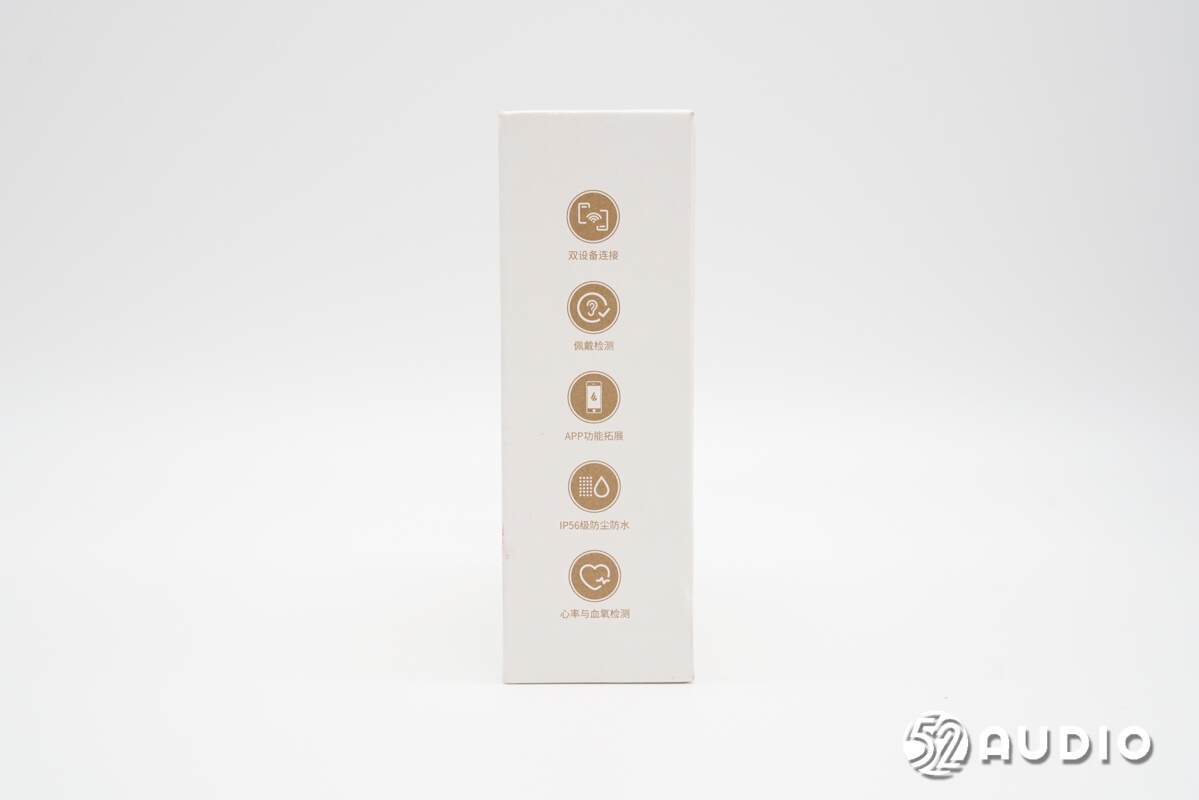 包装盒另外一侧图文展示的产品特点:双设备连接、佩戴检测、APP功能拓展、IP56级防尘防水、心率与血氧检测。