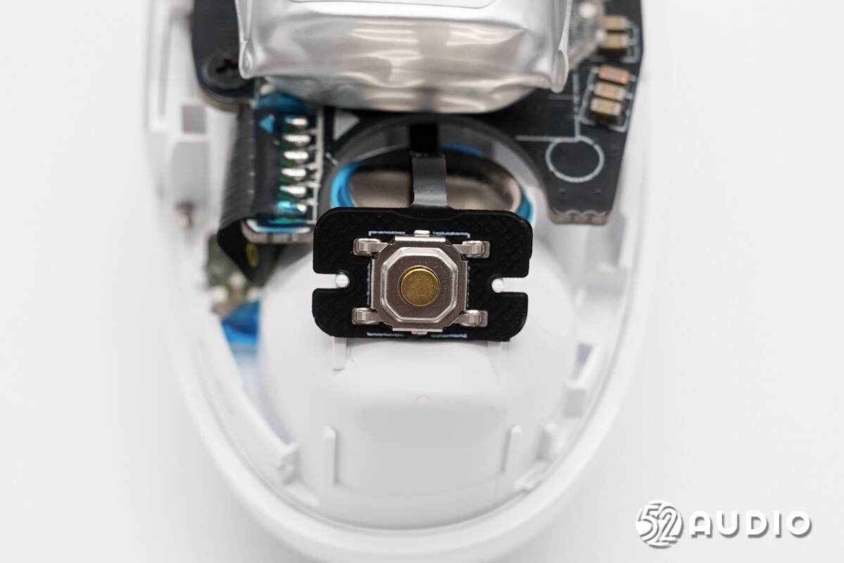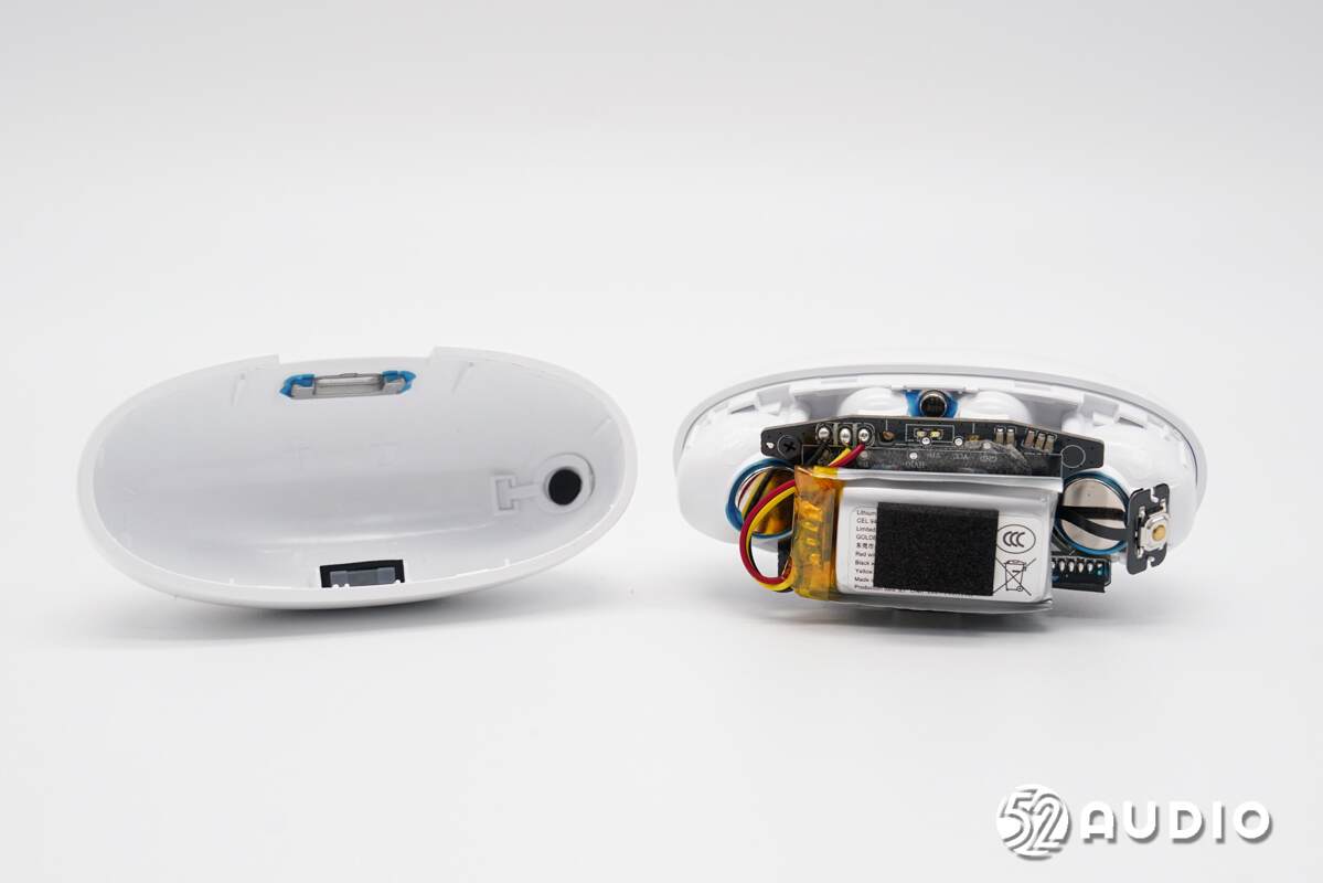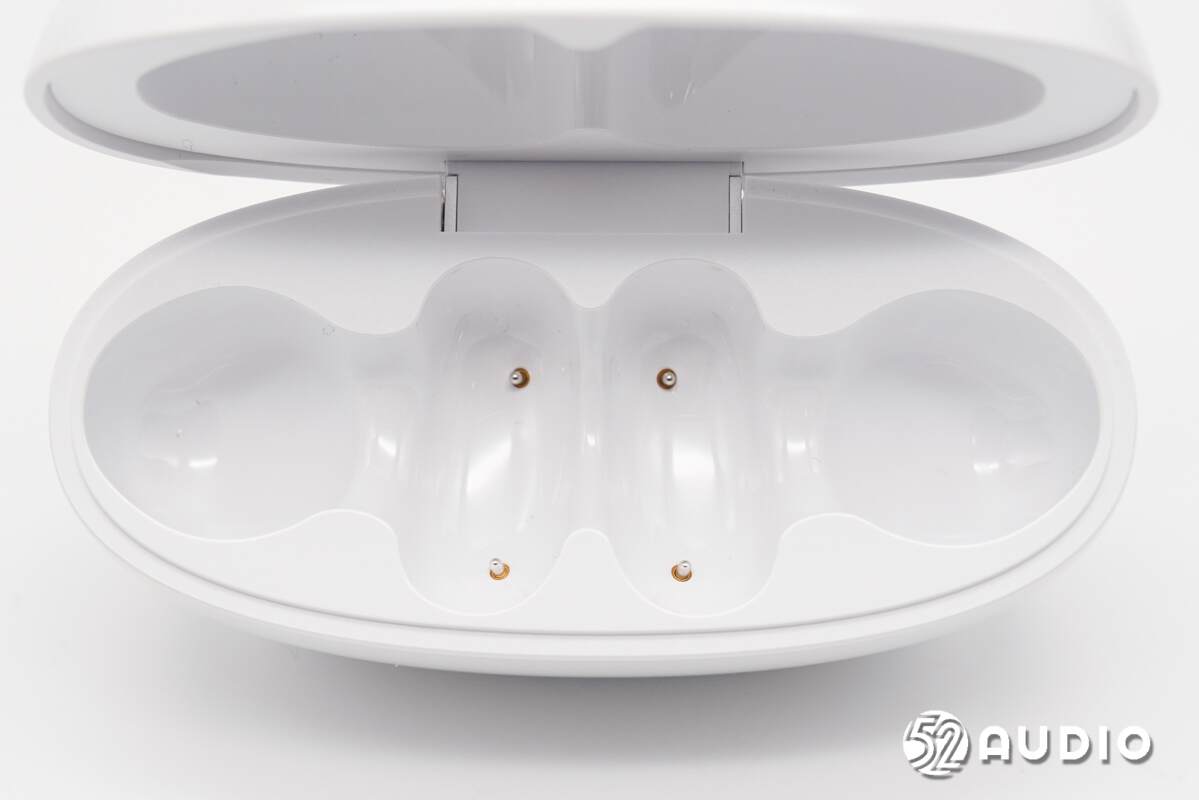 取出耳机,座舱内部结构一览。中间设置有为耳机充电的金属顶针。