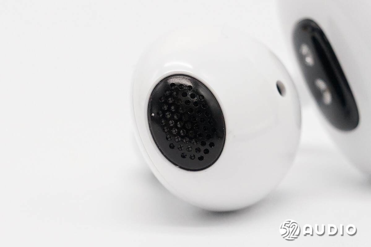 音腔出音孔特写,金属盖板防护。内部设置有反馈降噪麦克风。