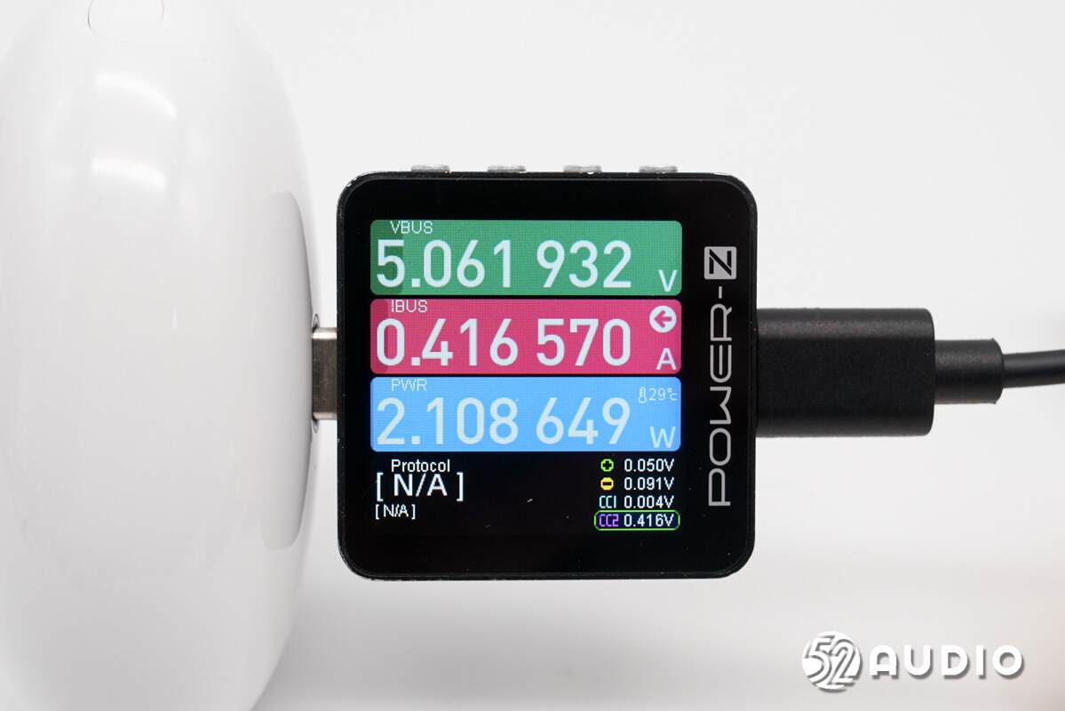 我爱音频网使用CHARGERLAB POWER-Z KM003C对EDIFIER漫步者LolliClip云感智能耳夹进行充电测试,输入功率约为2.11W。