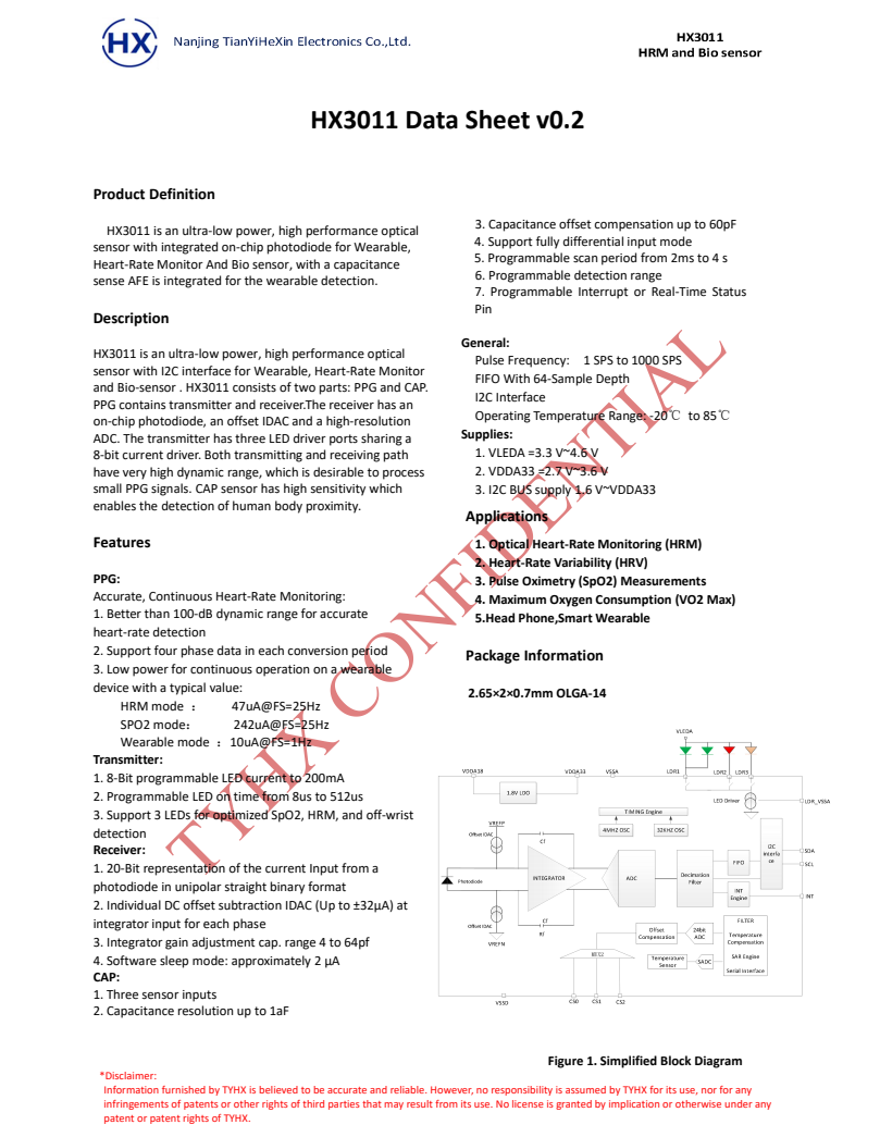 用于接收LED照射灯反射光线的的感应器。据我爱音频网了解到,该方案来自HX天易合芯,型号HX3011,是一款超低功耗、高性能的光学传感器,集成了PPG(光电容积脉搏波)和CAP(电容感应)两大模块,具有I2C接口,适用于可穿戴设备、心率监测和生物传感器。