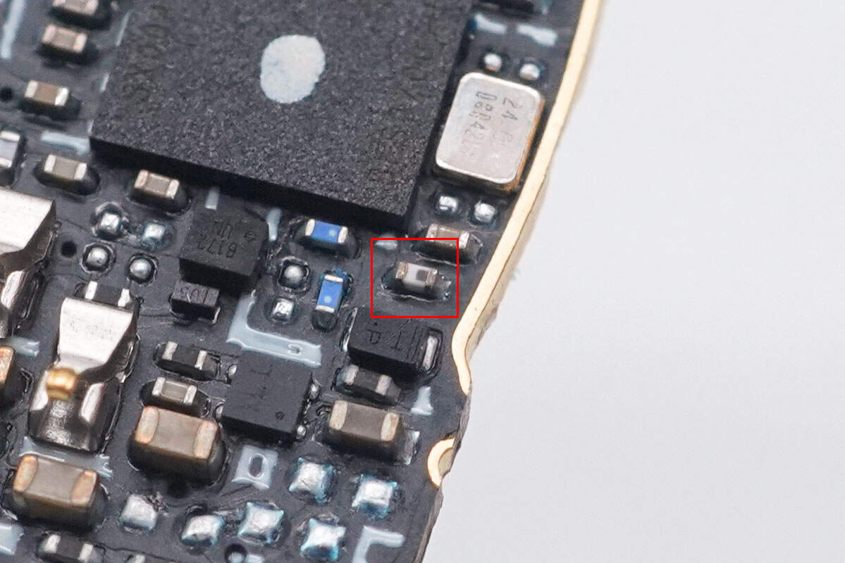 蓝牙芯片外围三颗Sunlord顺络电子MPHM系列功率电感特写,侧边印刷有一颗“白色圆点”标识。顺络电子MPHM系列具有优异的抗干扰/防耦合、漏磁的性能,大额定电流、高可靠性、DCR等优异的电性能;同时外形设计有Mark标识磁通方向,可以保证贴片后磁场方向一致;采用叠层工艺,满足主流的功率要求,为客户提供高性价比的产品。