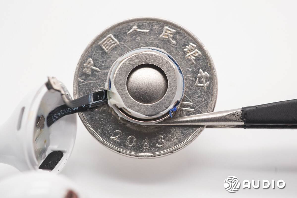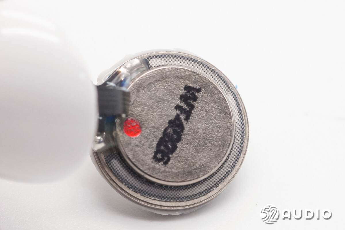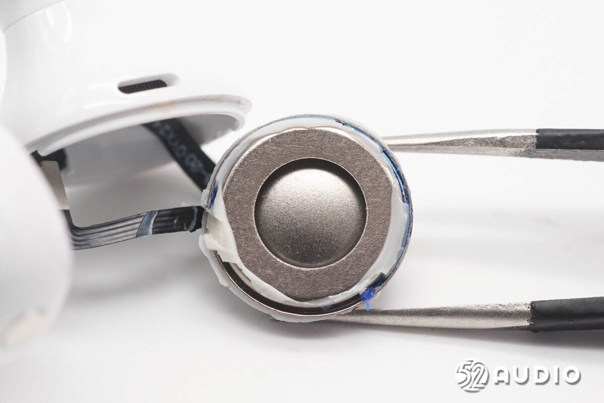 耳机搭载的扬声器正面振膜特写,镀钛球顶,通过金属盖板防护。