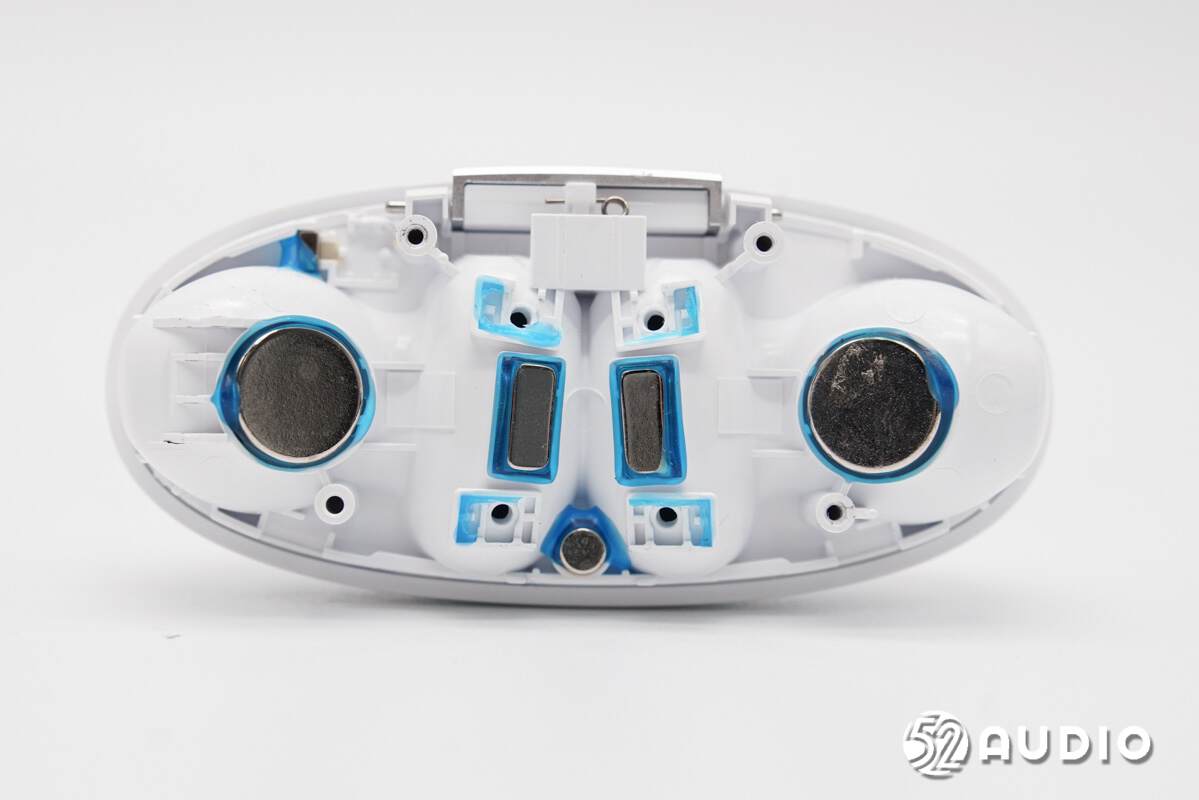 座舱底部结构一览,设置有5颗磁铁稳定吸附耳机和充电盒盖。