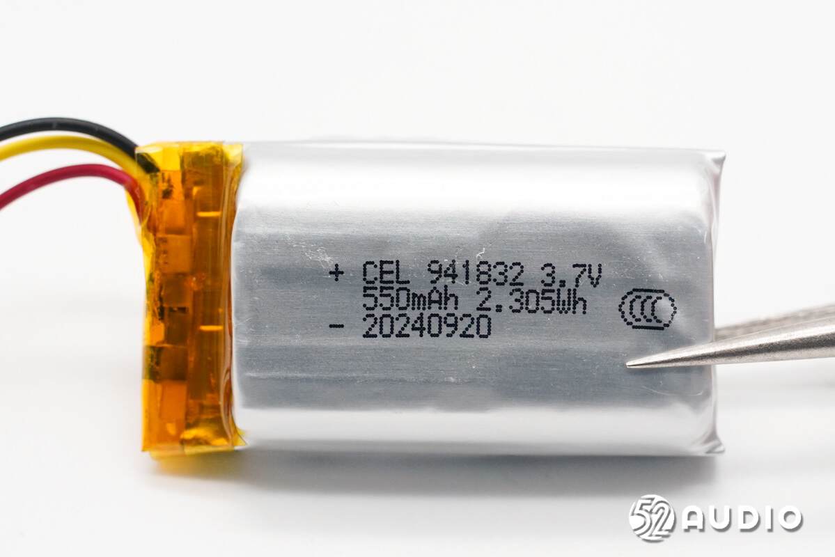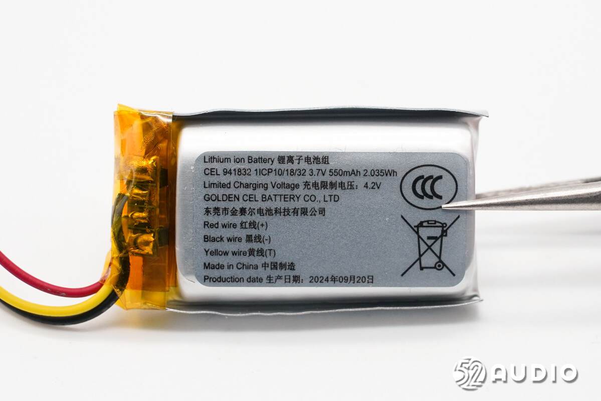 充电盒内置电池标签上信息,锂离子电池组,型号:CEL 941832,标称电压:3.7V,额定容量:550mAh 2.035Wh,充电限制电压:4.2V,来自东莞市金赛尔电池科技有限公司。