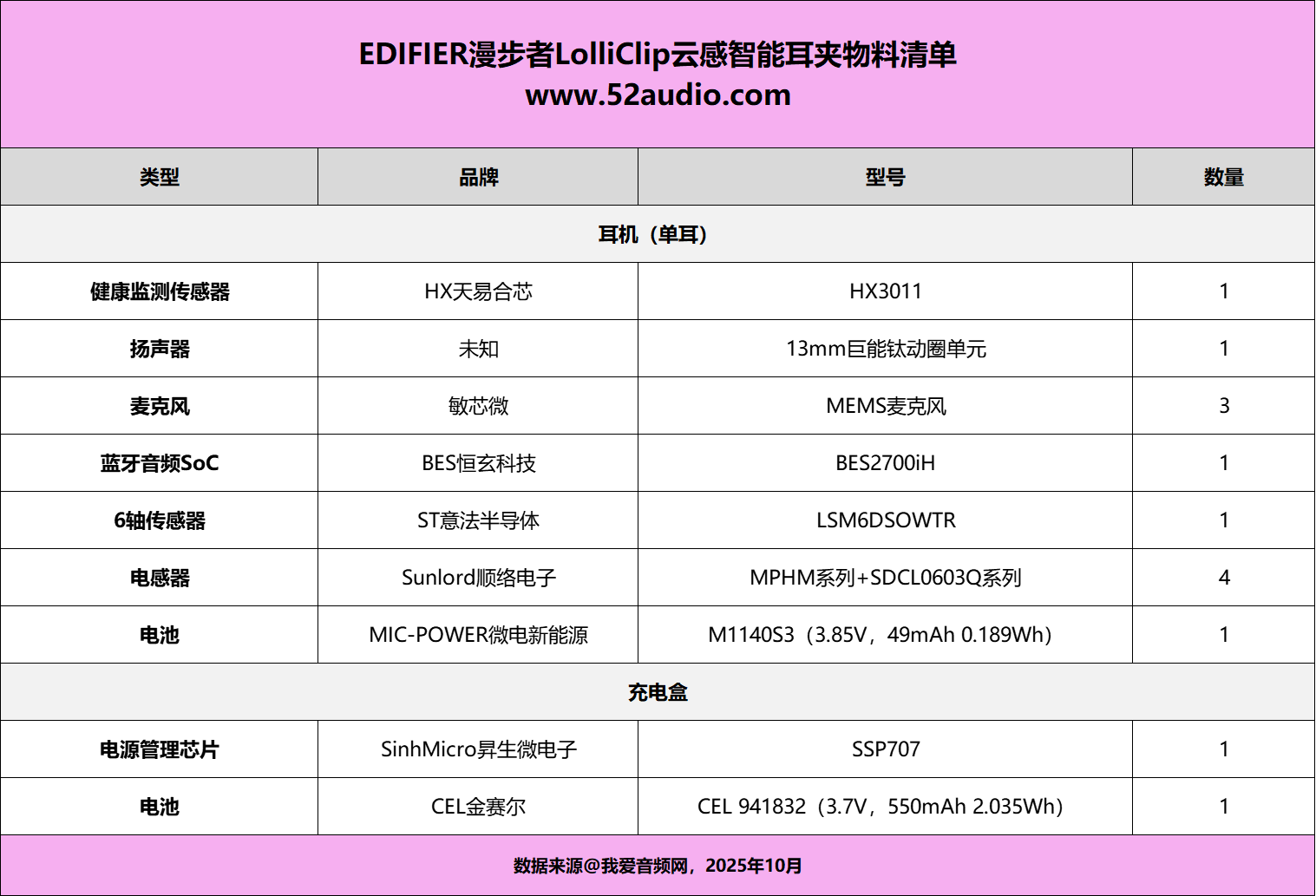 最后附上EDIFIER漫步者LolliClip云感智能耳夹的已知核心物料清单,方便大家查阅。