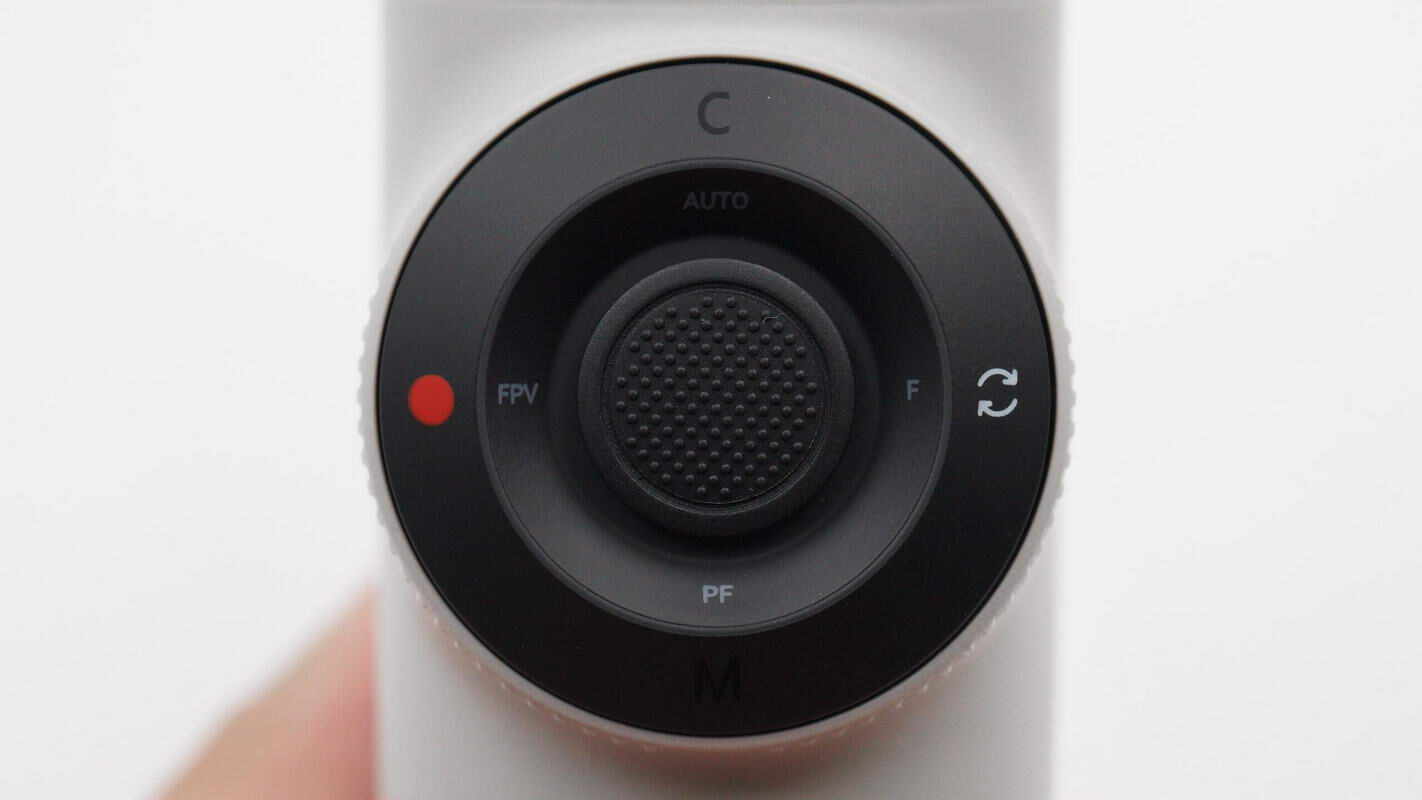 手柄正面触控面板特写,边缘设有电源键/M键(下)、C键(上)、快门键(左)和切换键(右),中心设有摇杆。此外在C键旁还设有电量指示灯/云台模式指示灯。