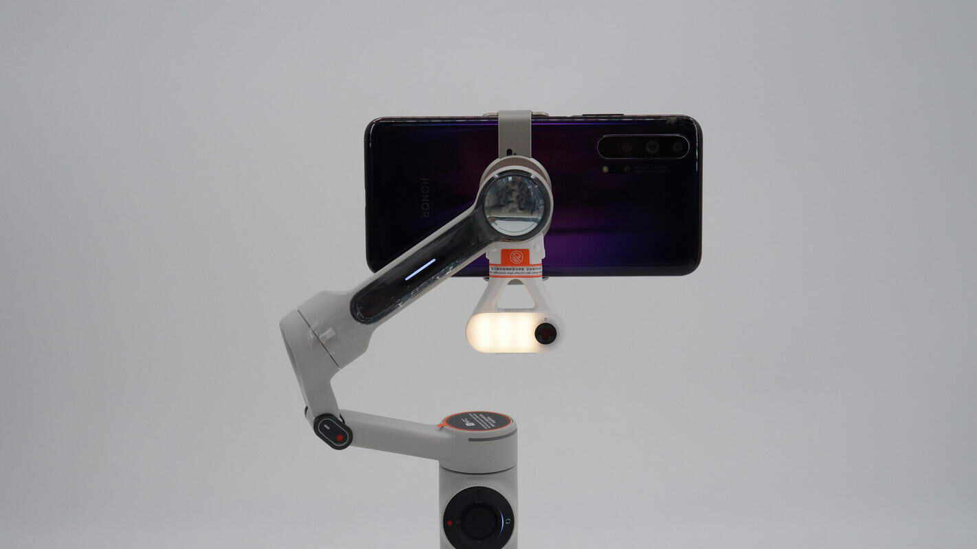 轴臂背面则设有俯仰轴指示灯和自拍镜。