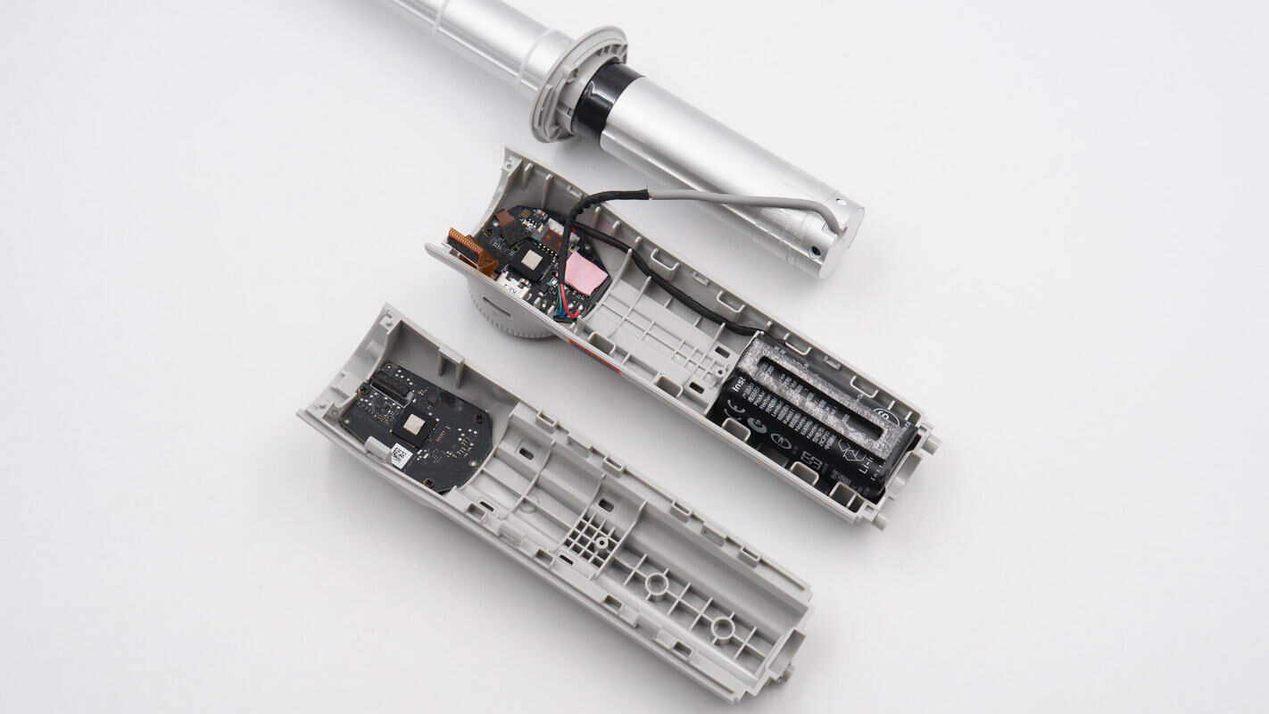 手柄内部设有触控面板、扳机键的对应PCB板以及电池组,两块PCB板之间通过排线连接。