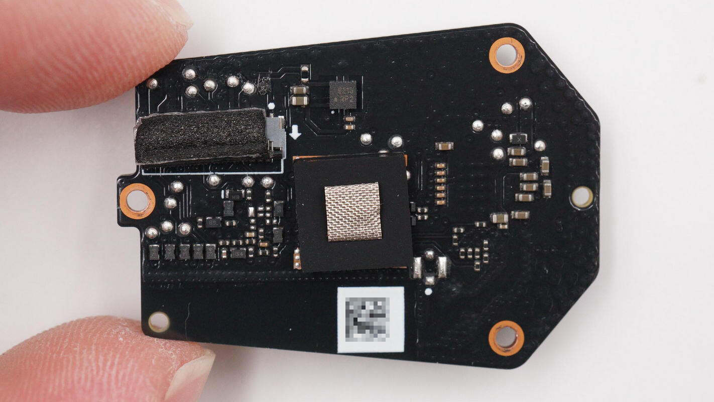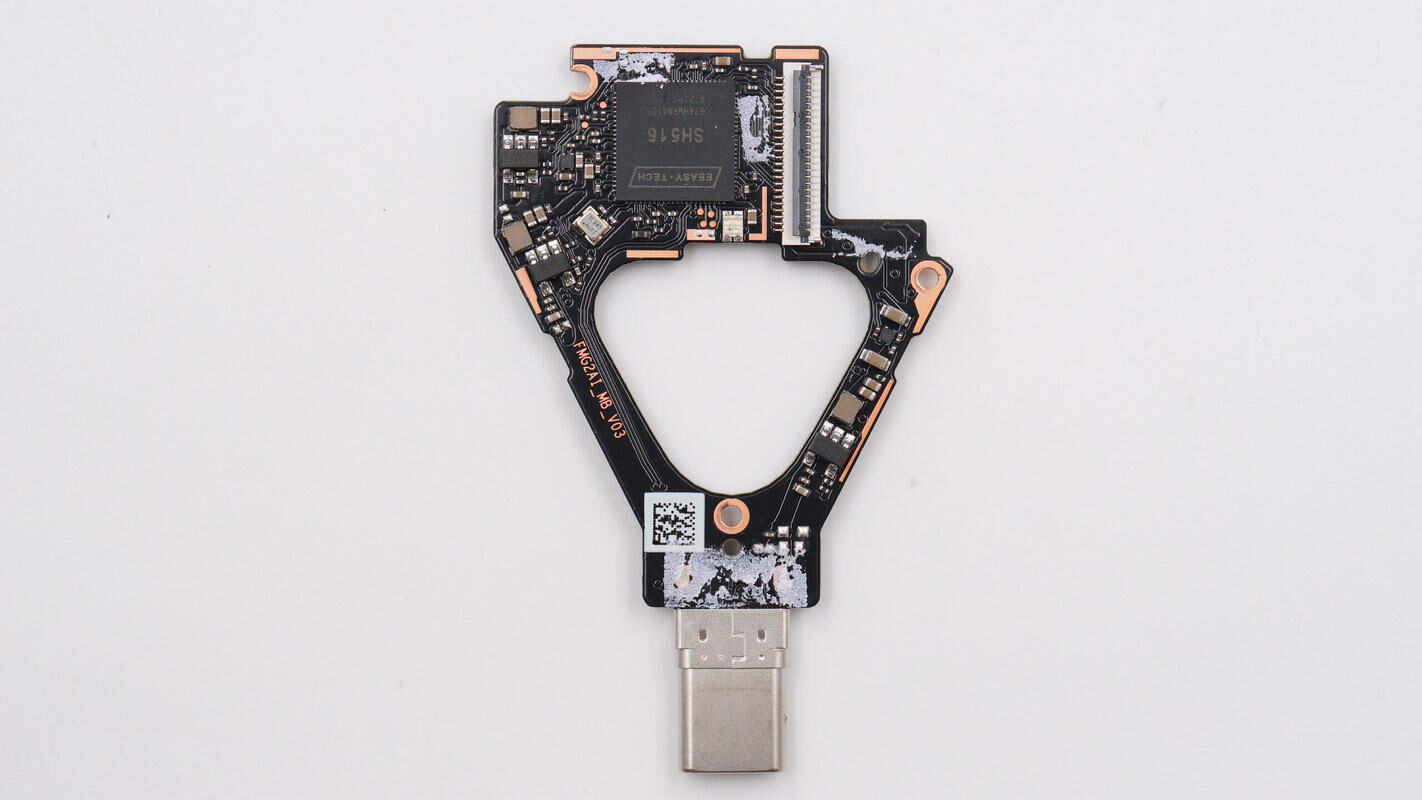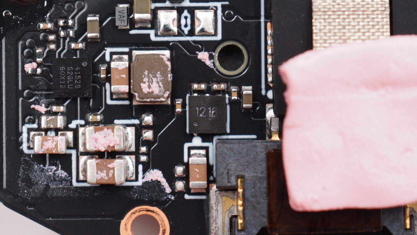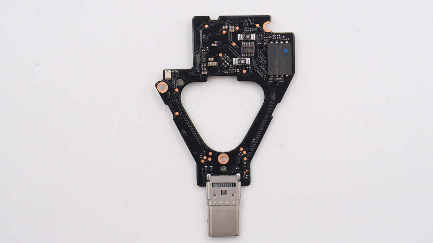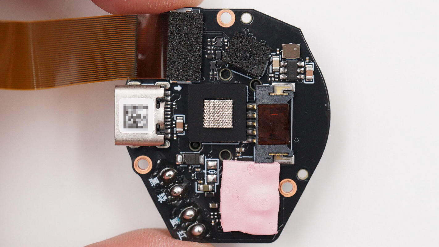 板子另一面焊接USB-C接口母座、降压芯片、电池充电芯片等,电池充电芯片区域贴有导热垫,中心还贴有导电布。