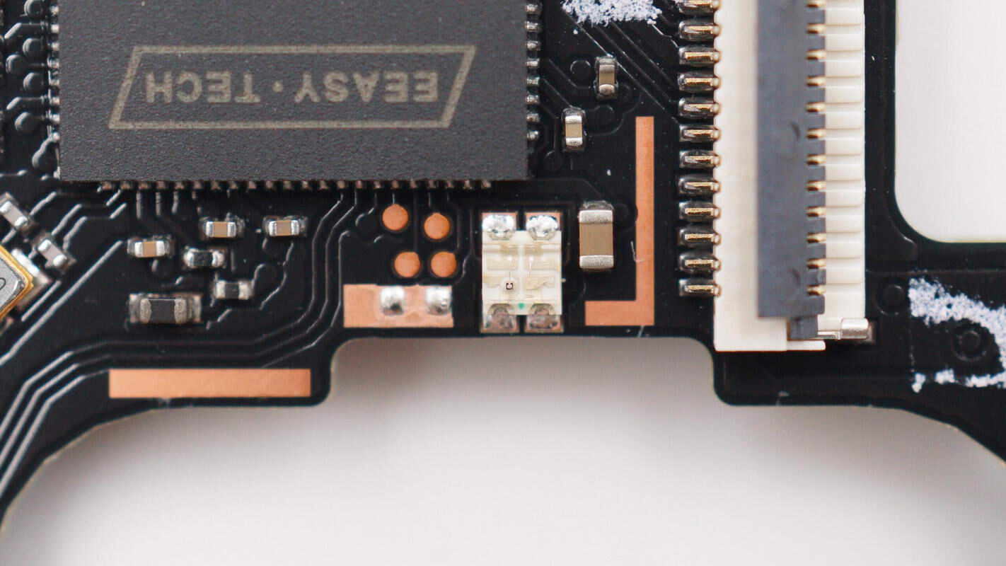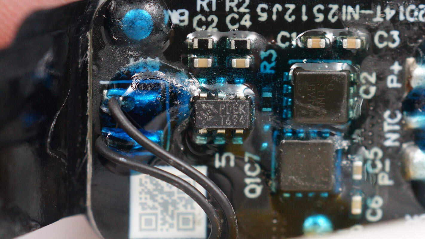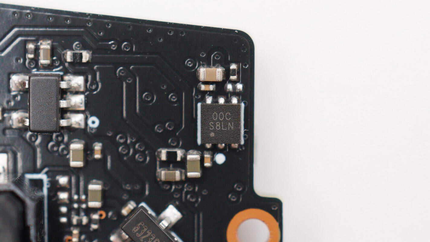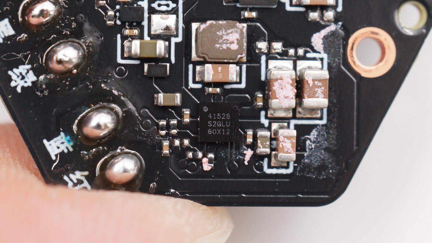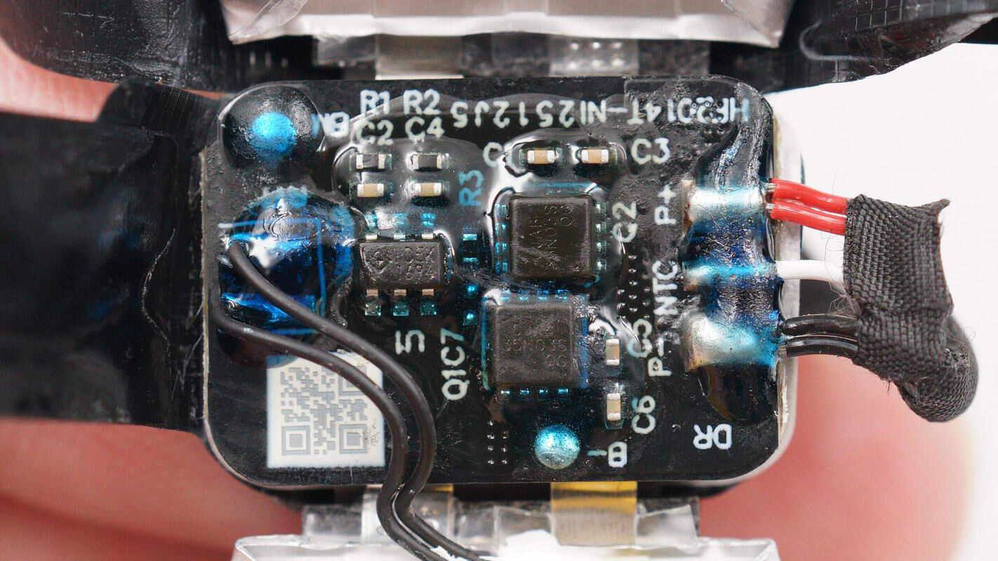 板子另一面焊接USB-C接口母座、降压芯片、电池充电芯片等,电池充电芯片区域贴有导热垫,中心还贴有导电布。