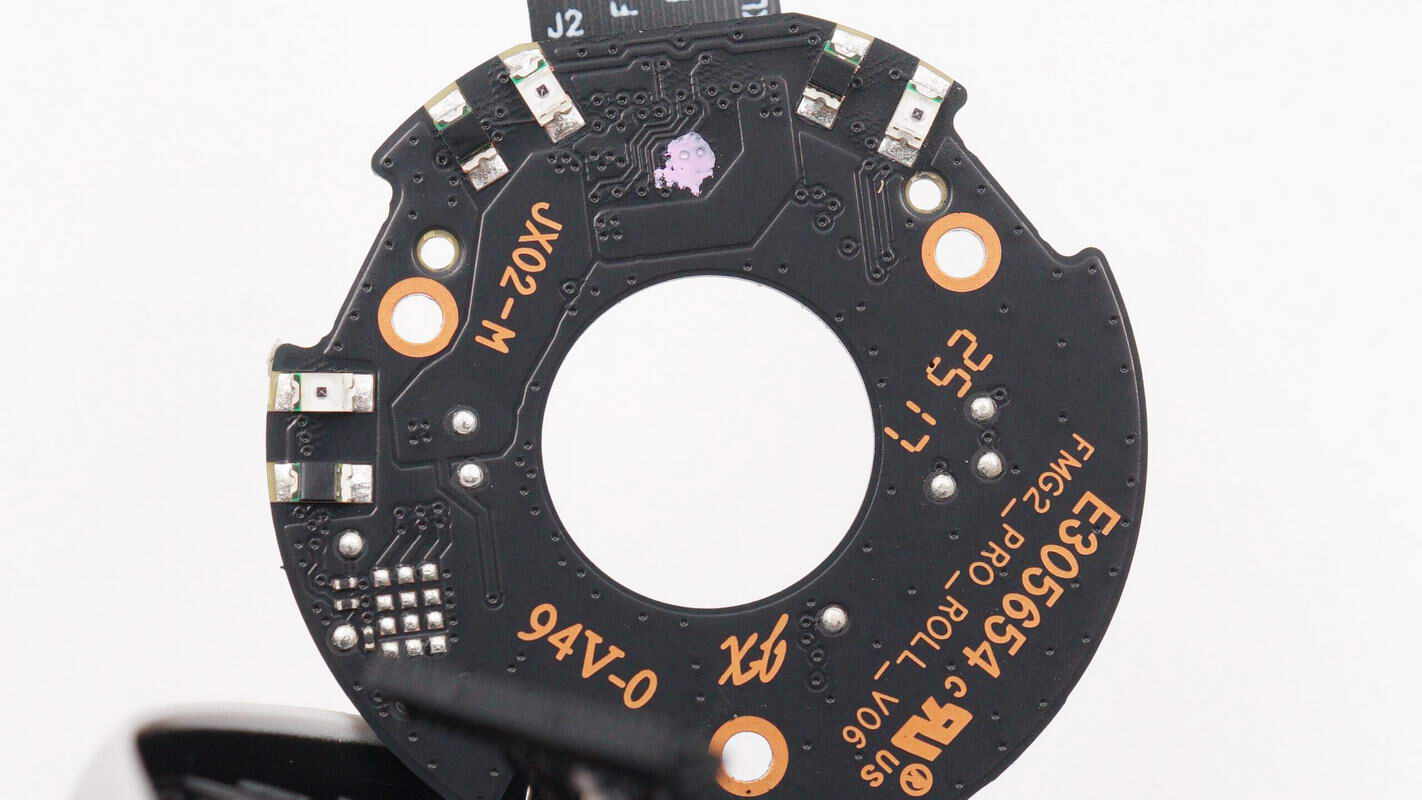 圆形PCB板另一面设有三组红外LED用于角度检测。