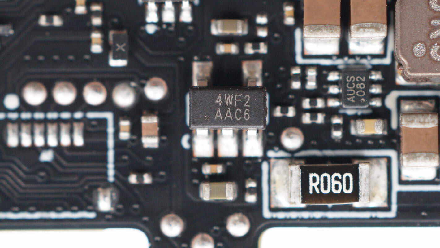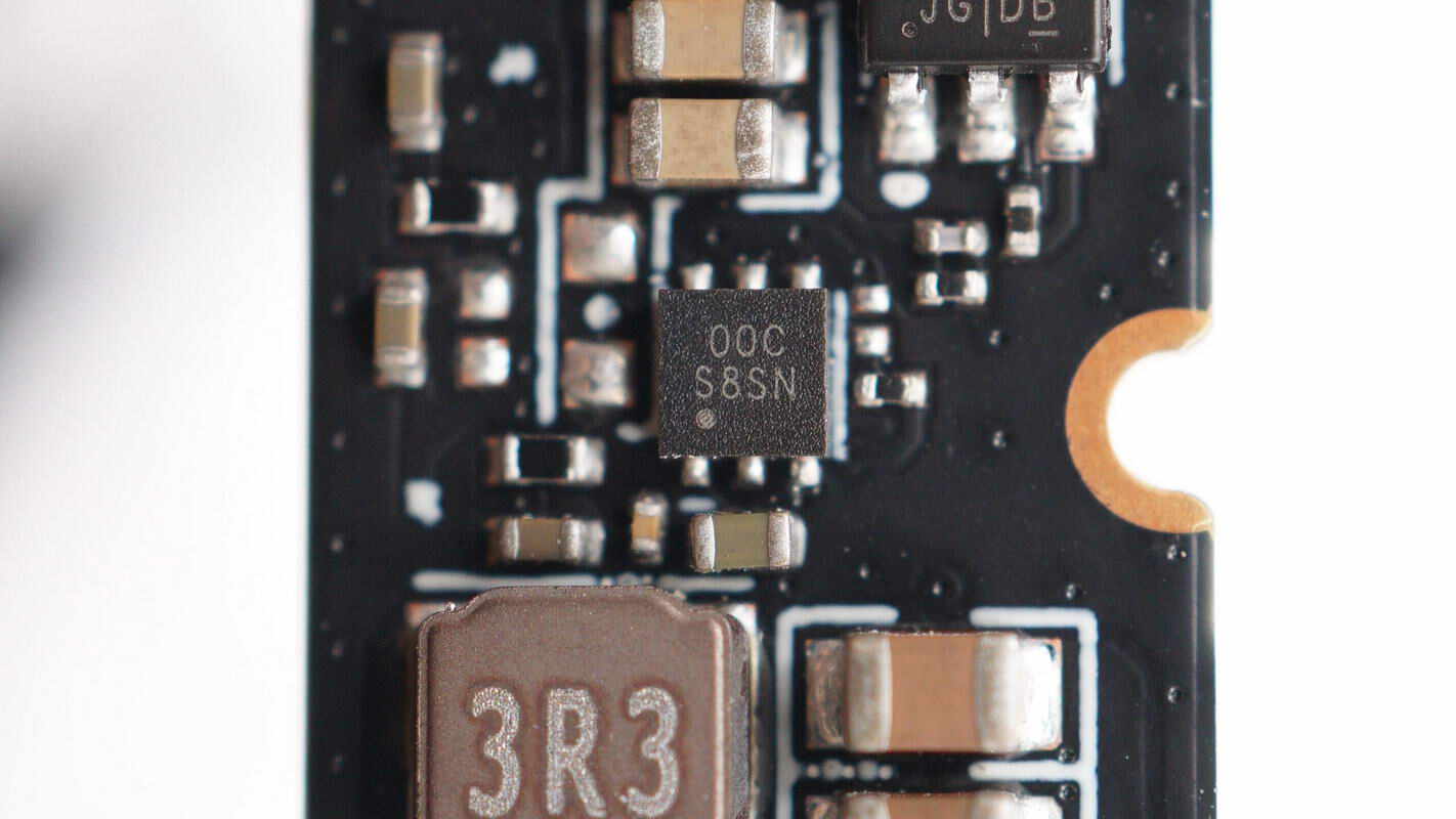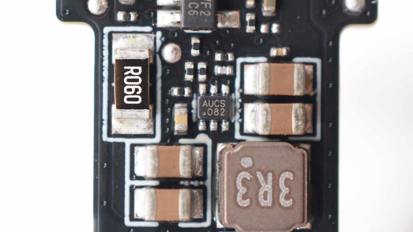 降压芯片来自芯源系统,丝印AUC,型号MP1653,是一颗4.2-17V输入电压,3A输出电流的同步降压转换器,芯片内部集成开关管,开关频率800kHz,具备快速负载响应和软启动,集成过电流保护和过热关断,采用SOT563封装。