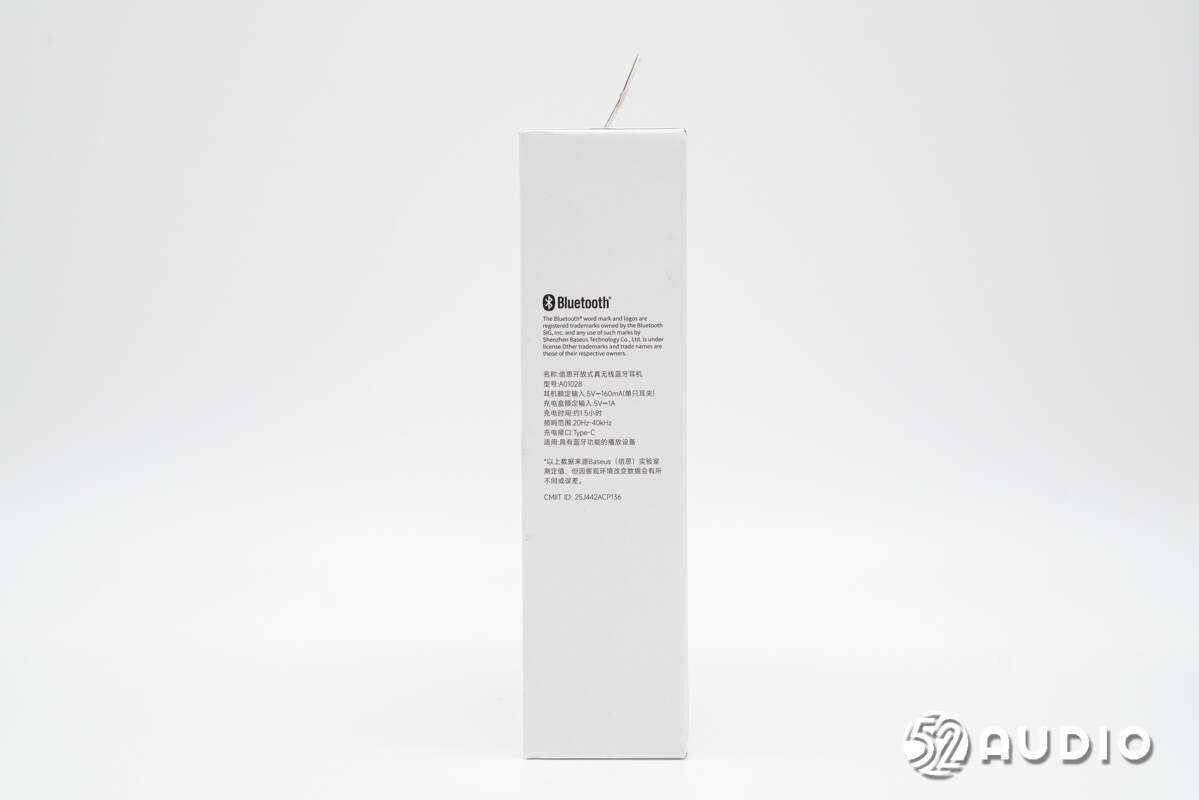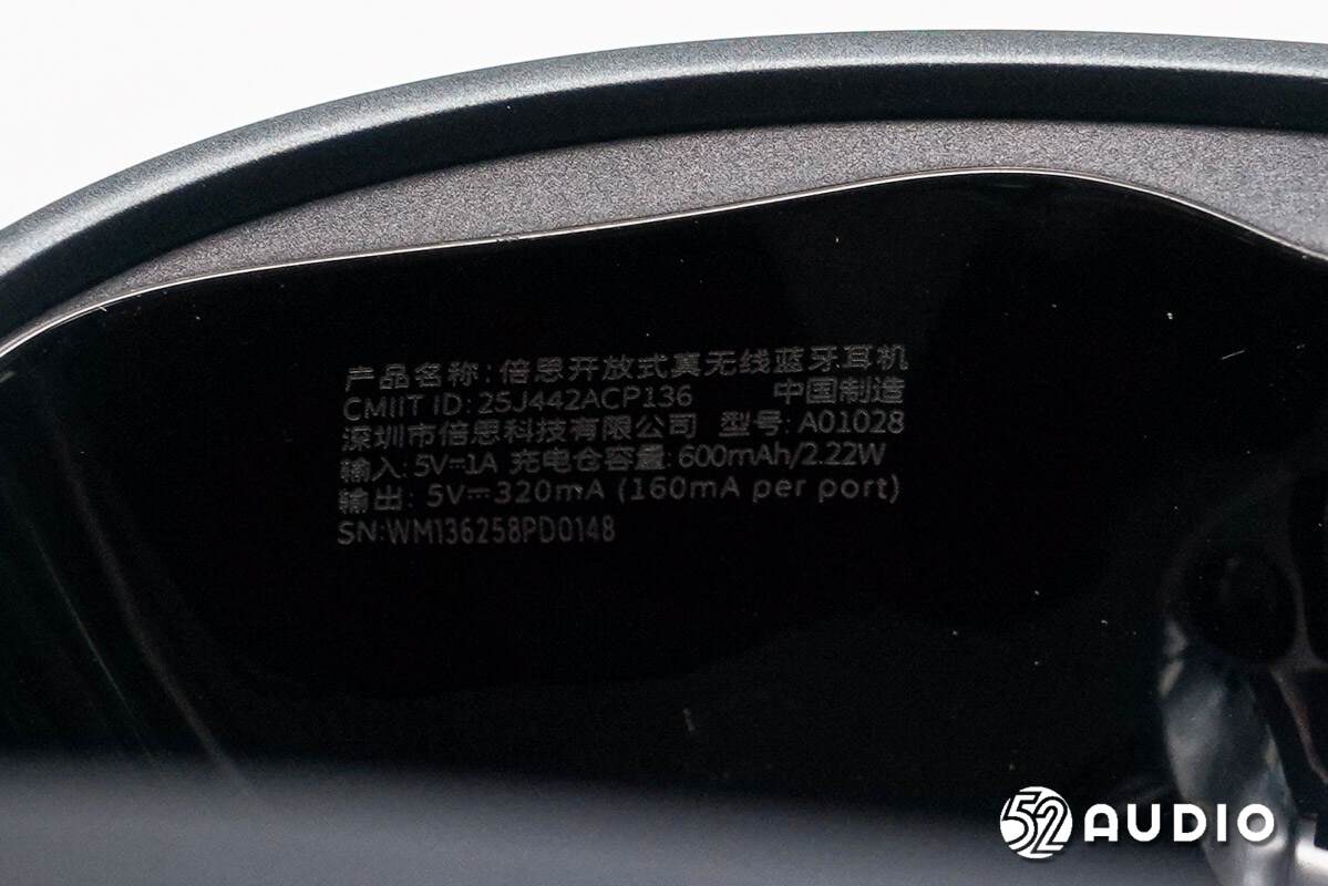 包装盒侧边介绍了产品参数信息。名称:倍思开放式真无线蓝牙耳机,型号:A01028,耳机额定输入:5V-160mA(单只耳夹),充电仓额定输入:5V-1A,充电时间:约1.5小时,频响范围:20Hz-40kHz,充电接口:Type-C,适用:具有蓝牙功能的播放设备。