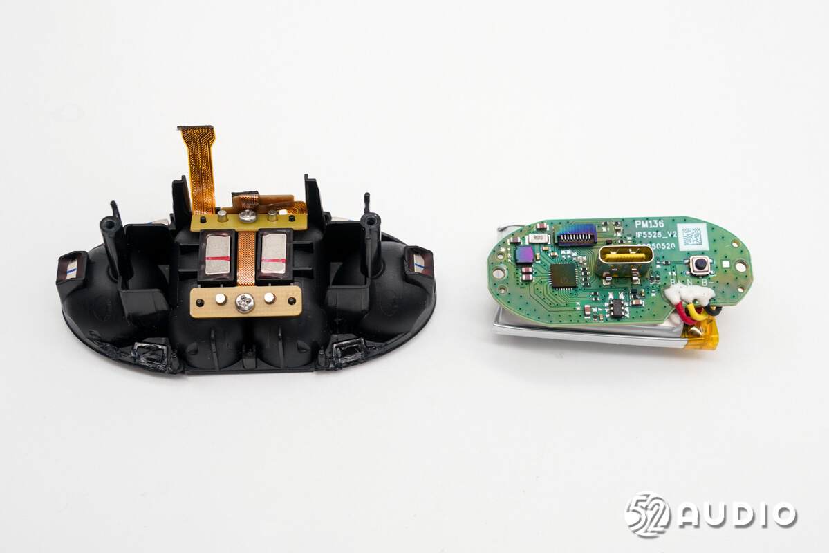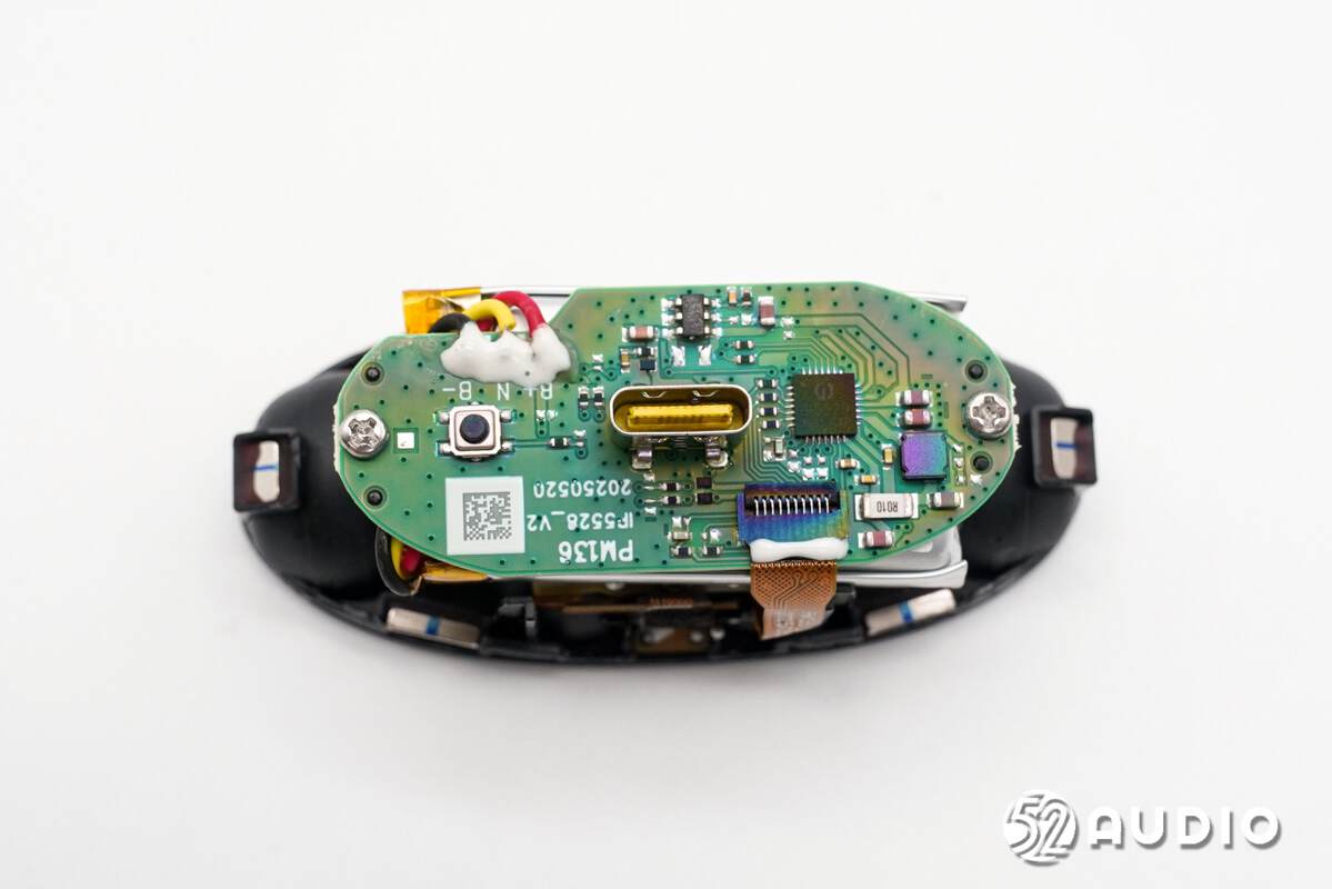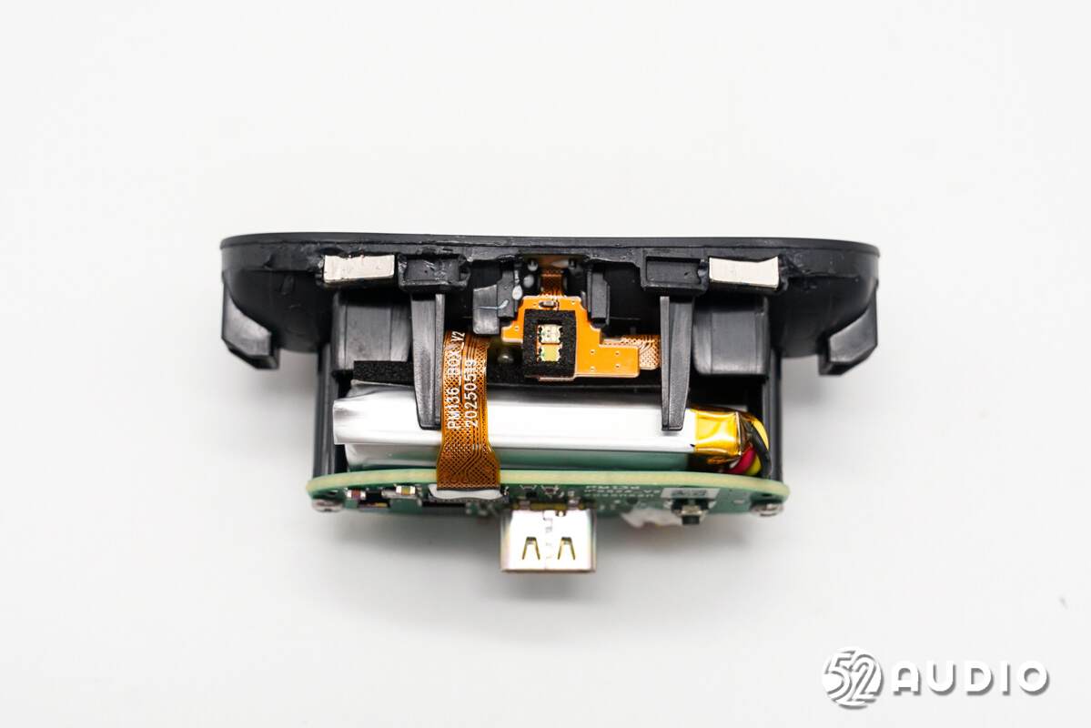 拆开后端腔体,内部设置有主板和电池单元。盖板上贴有电容式佩戴检测传感器,实现摘取自动暂停音乐播放,佩戴自动恢复音乐播放功能。