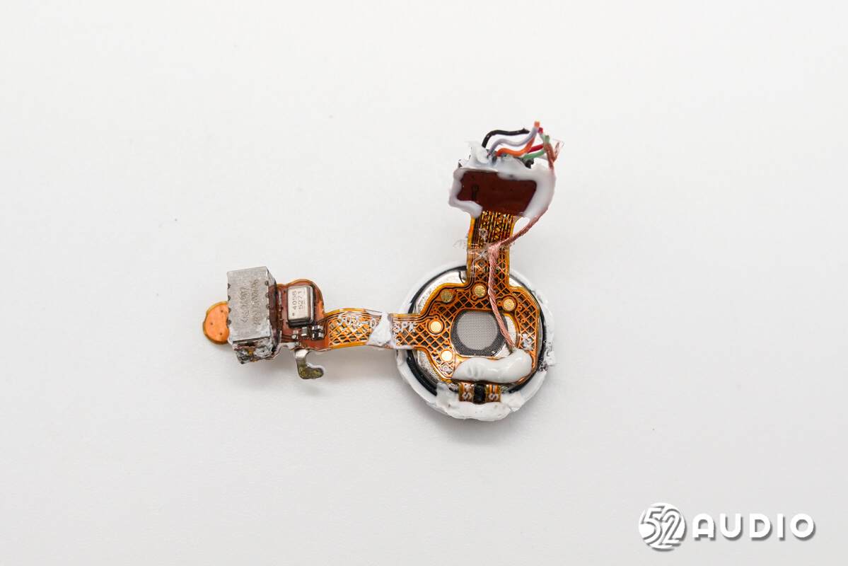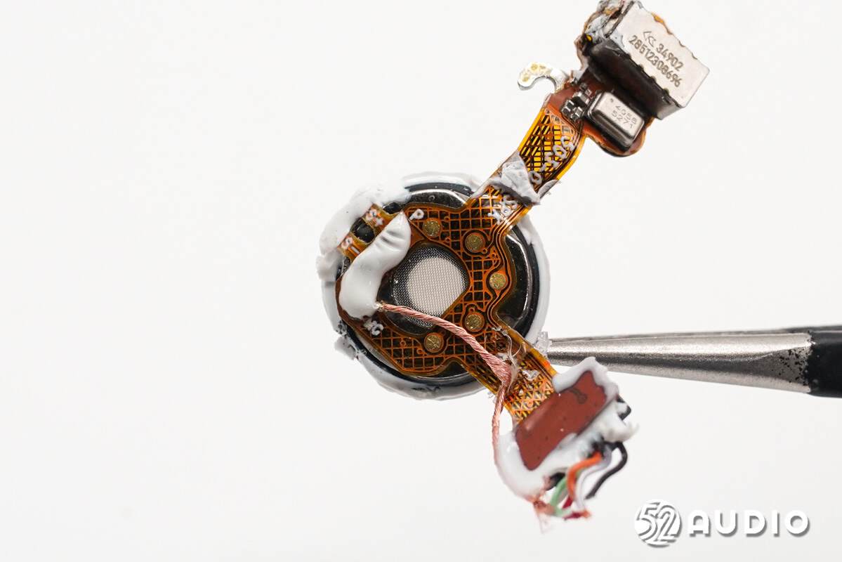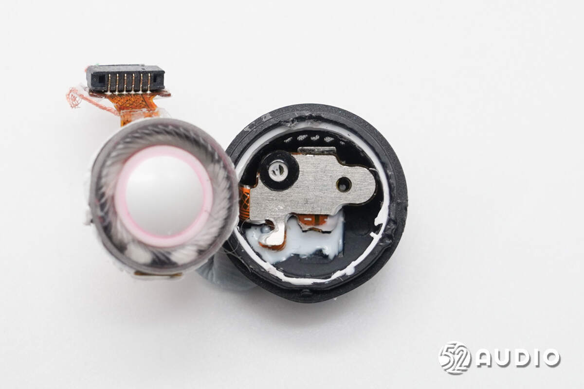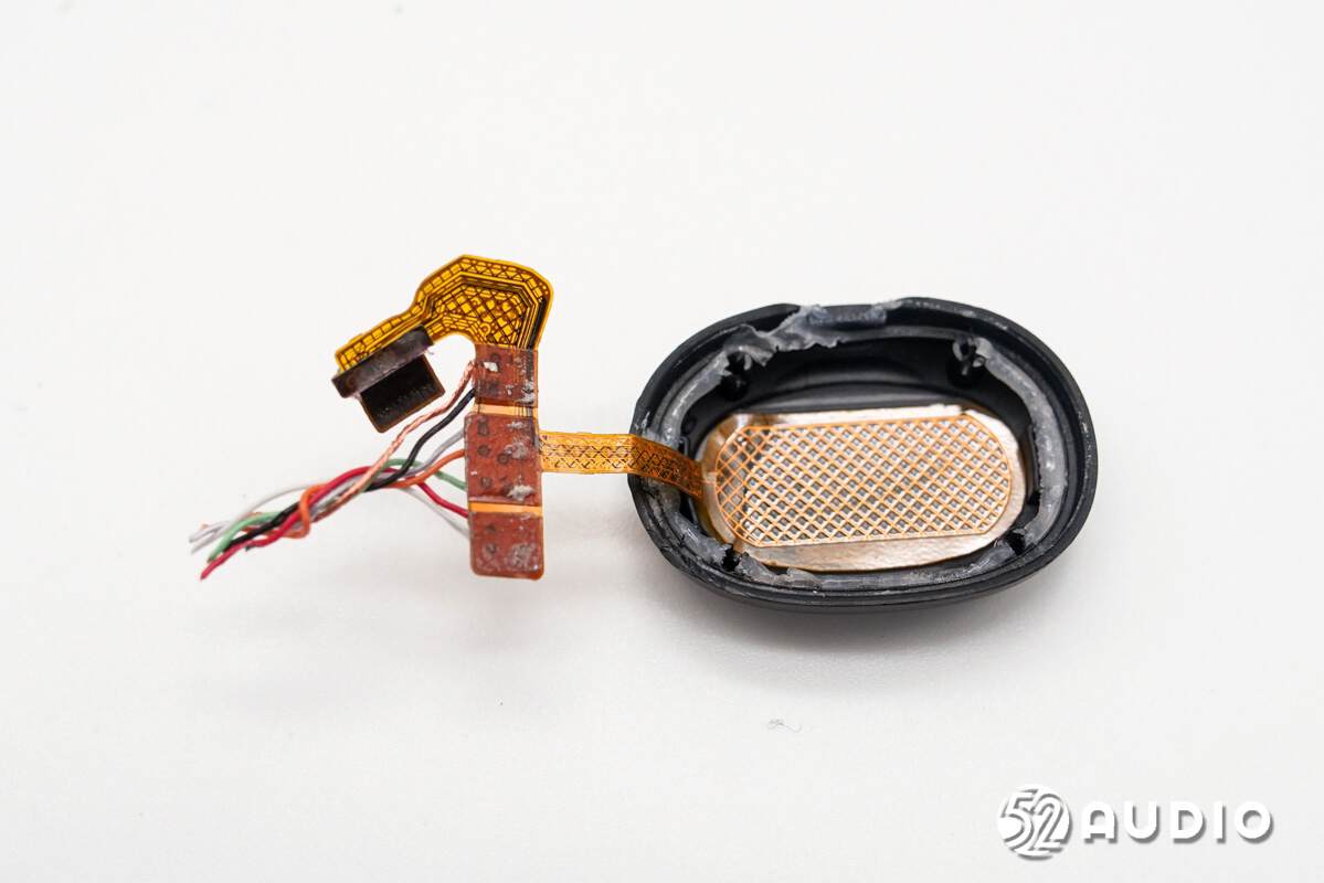 掀开扬声器,排线末端连接动铁单元和麦克风,通过金属板固定。