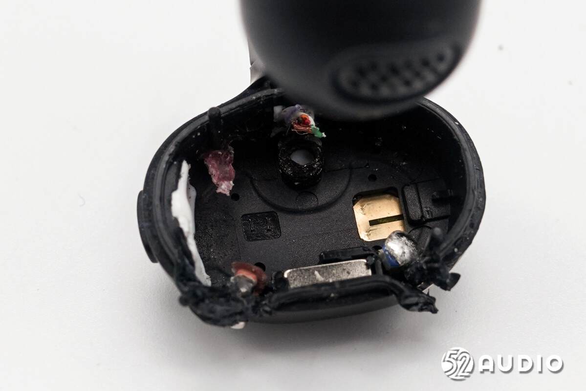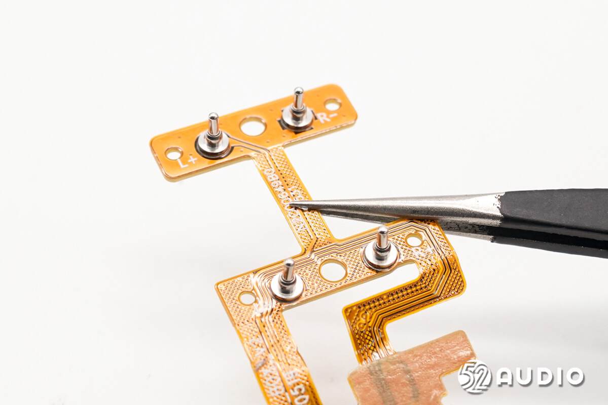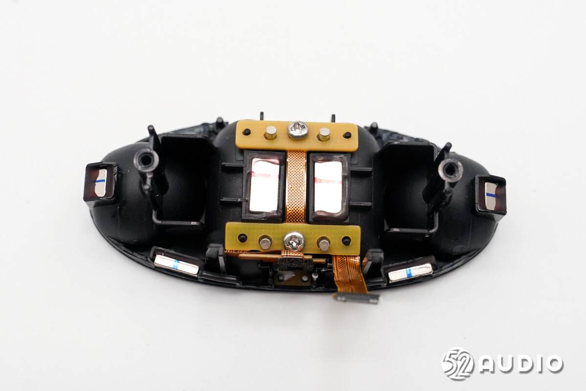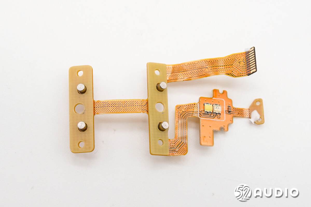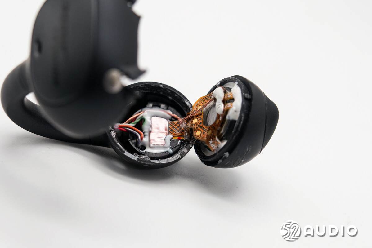 掀开扬声器,排线末端连接动铁单元和麦克风,通过金属板固定。