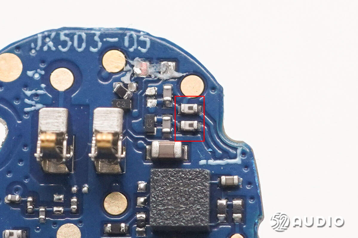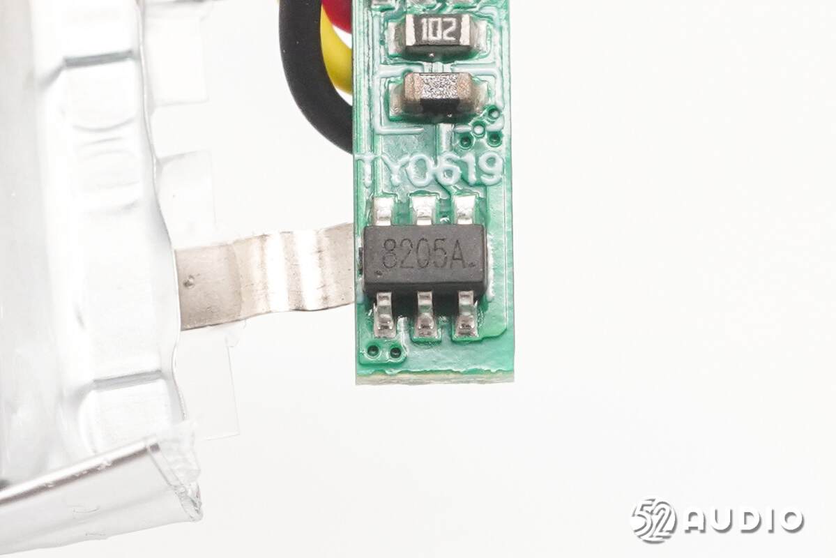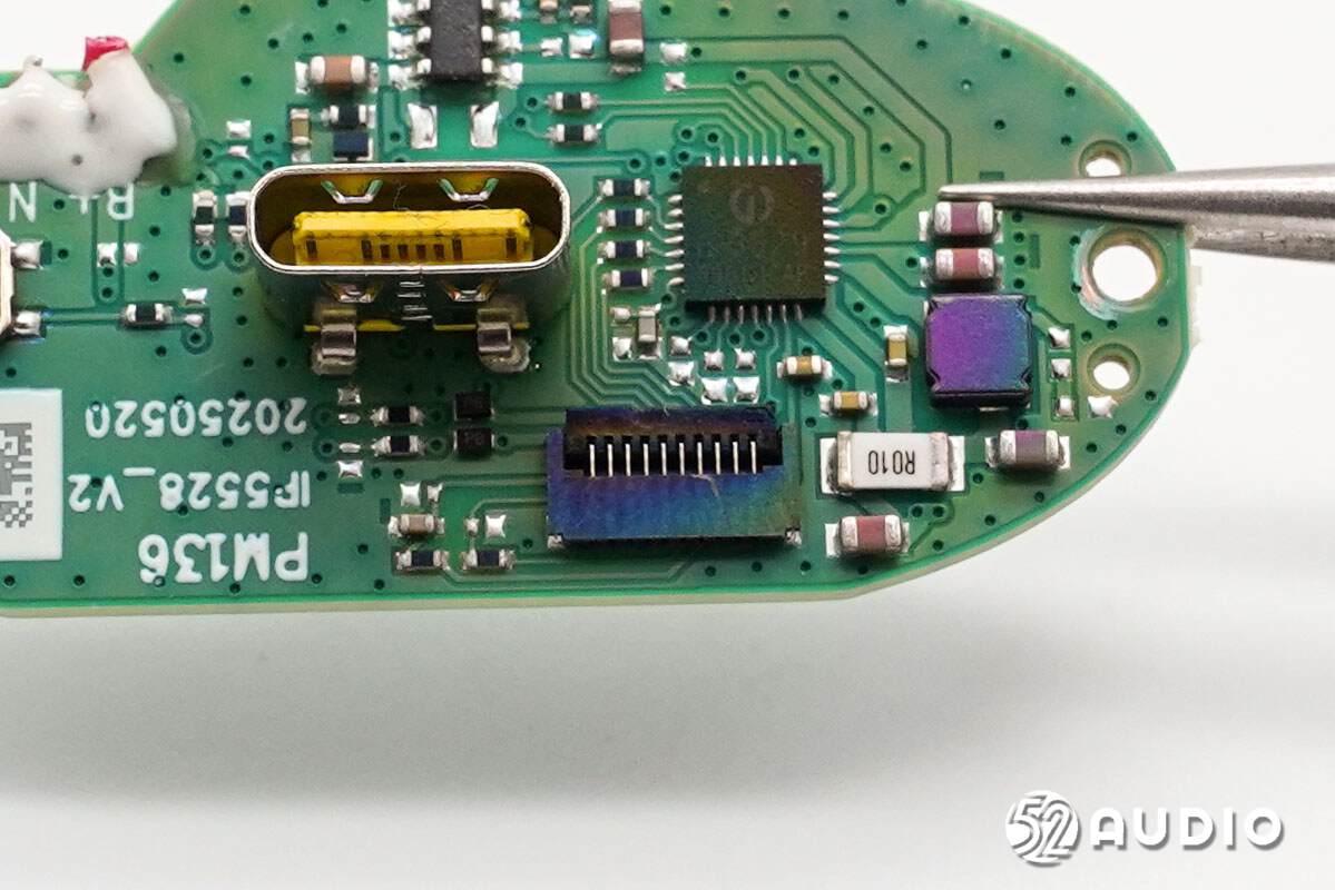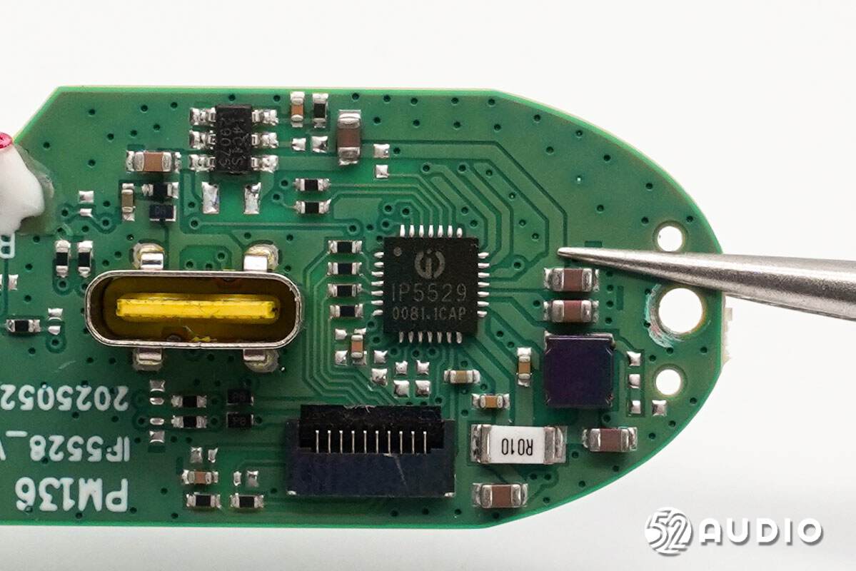 丝印AR5J7的霍尔元件,用于感知耳机出入仓时的磁场变化,进而通知充电盒MCU和耳机与已连接设备配对或断开连接。