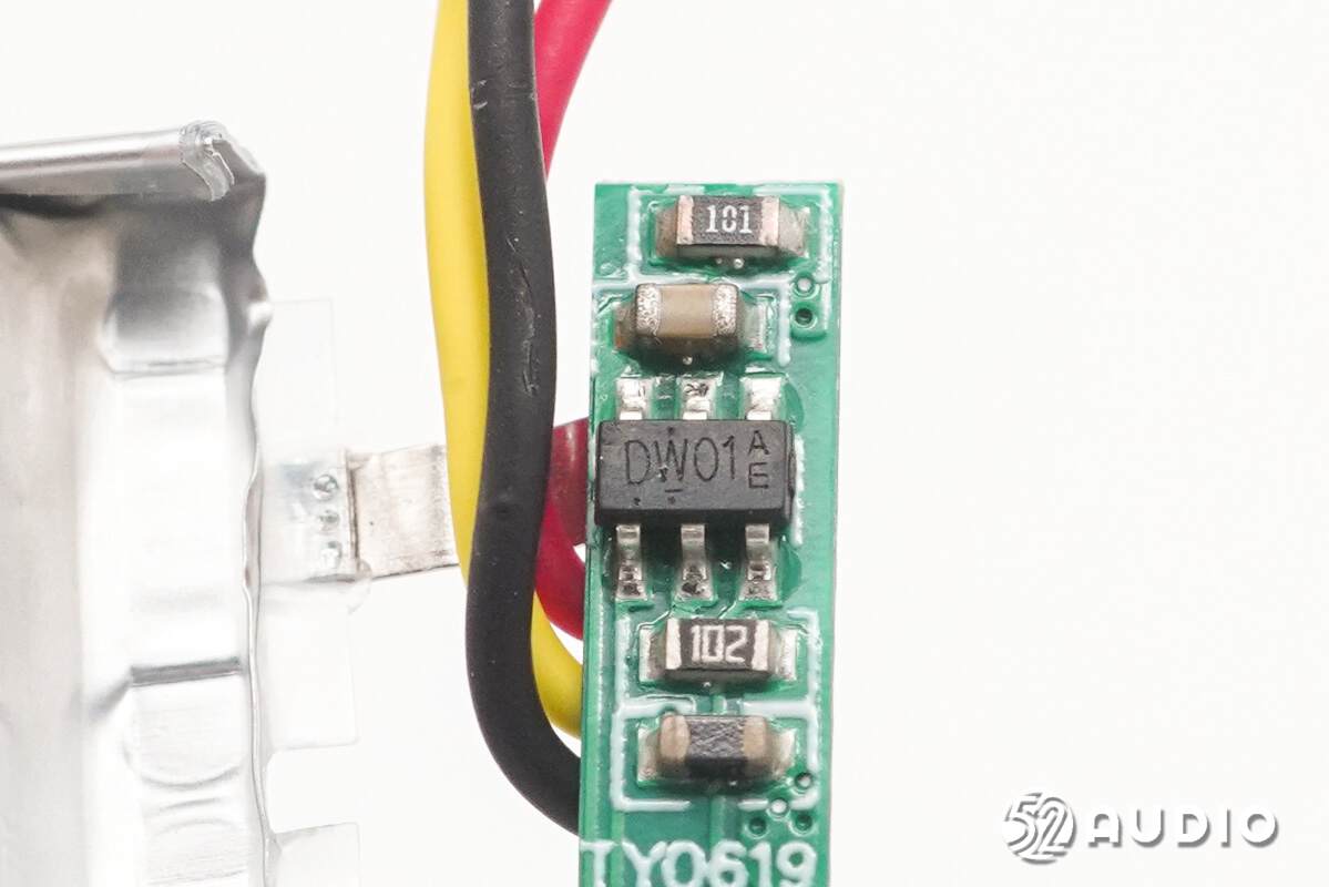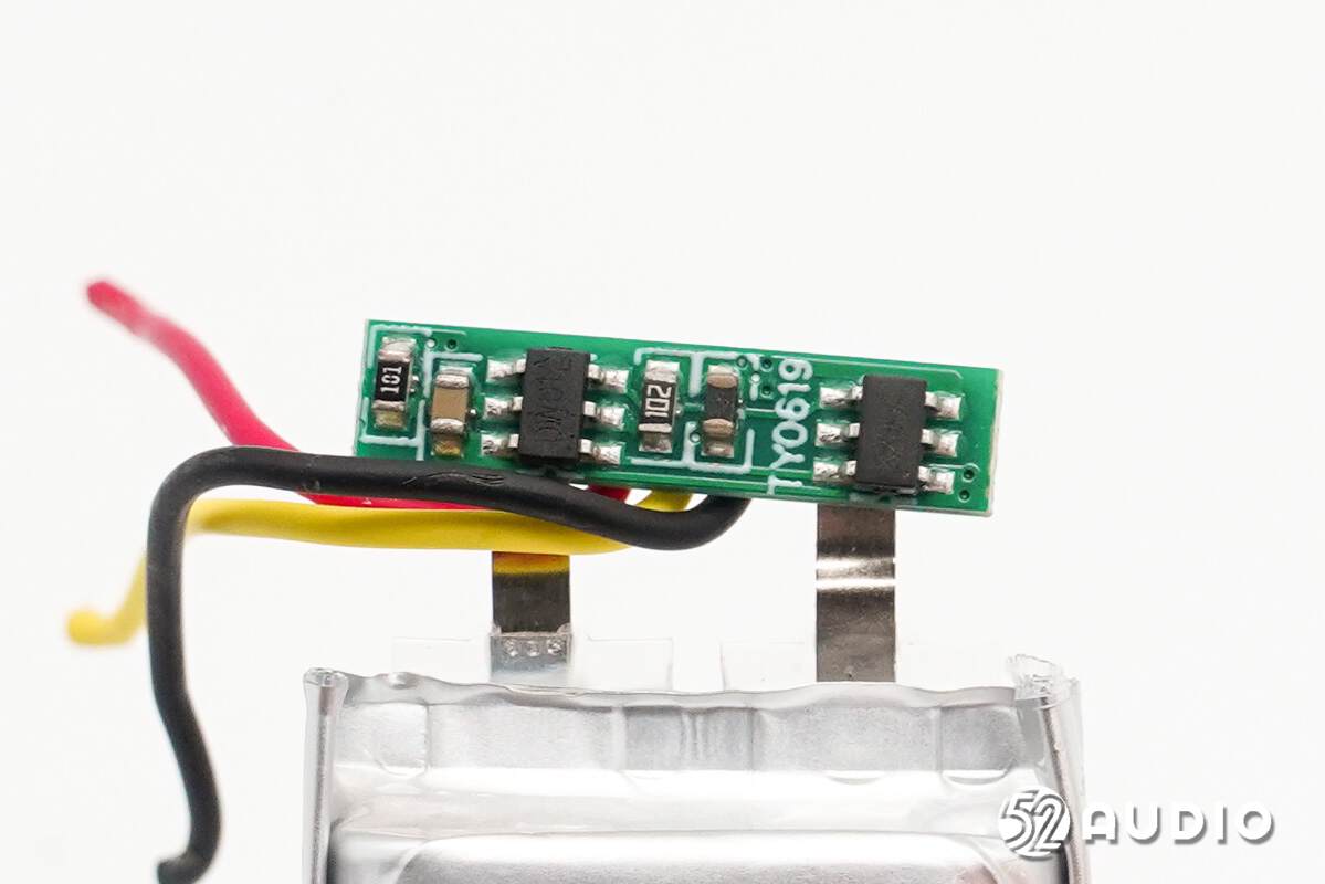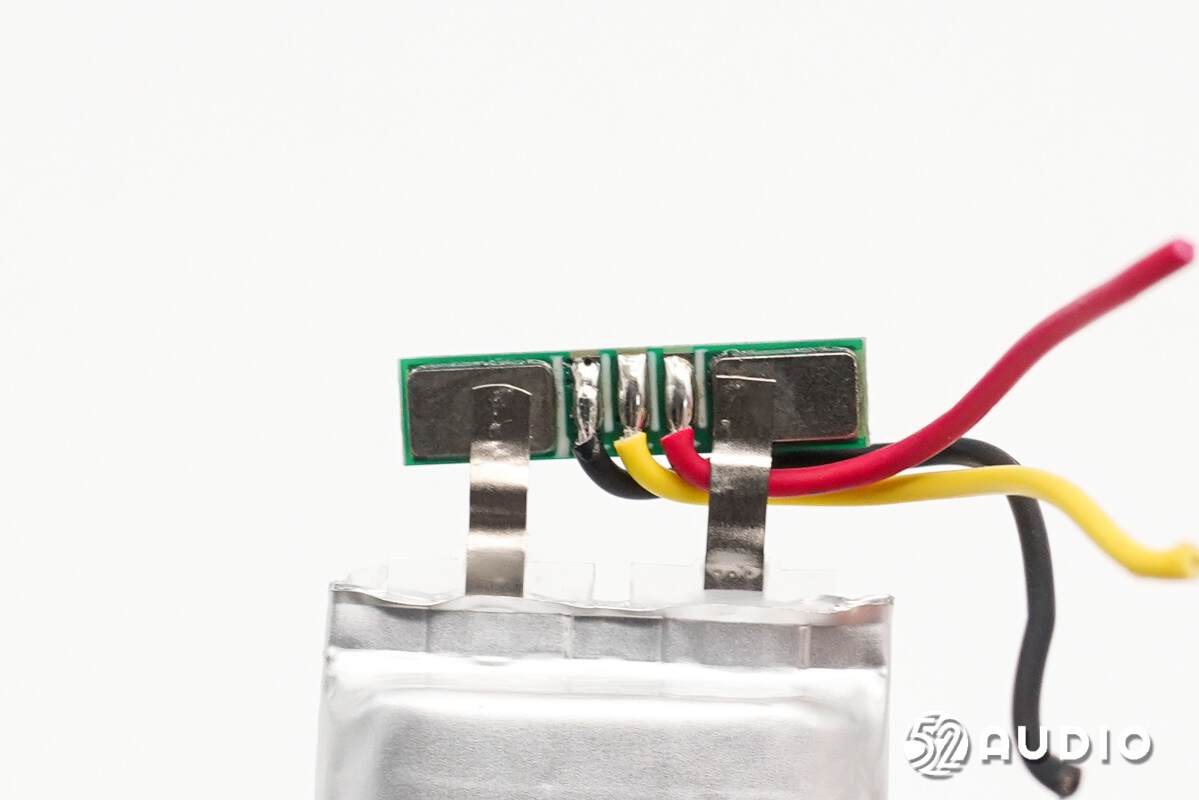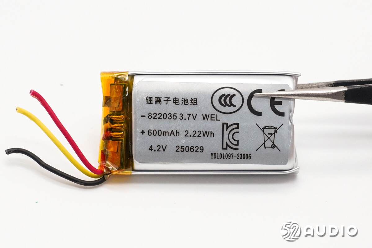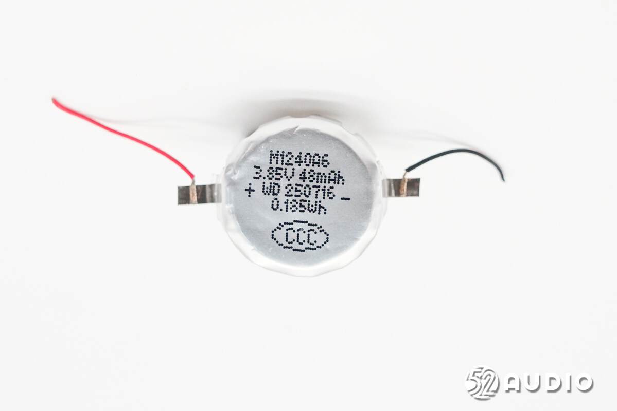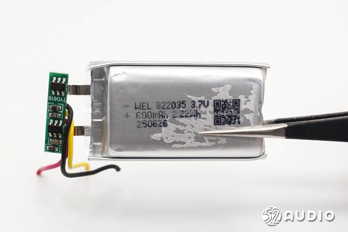 耳机内置软包扣式电池,型号:M1240A6,标称电压:3.85V,容量:48mAh 0.185Wh,来自WD微电新能源。