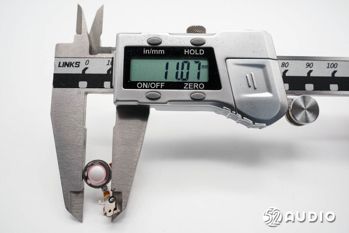 经我爱音频网实测,扬声器直径约为11mm,与官方数据10.8mm在合理误差内。