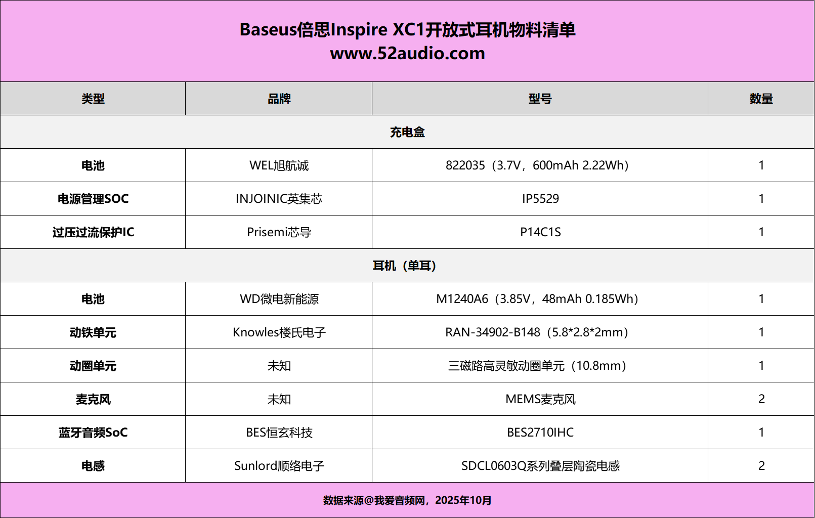 最后附上Baseus倍思Inspire XC1开放式耳机的已知核心物料清单,方便大家查阅。