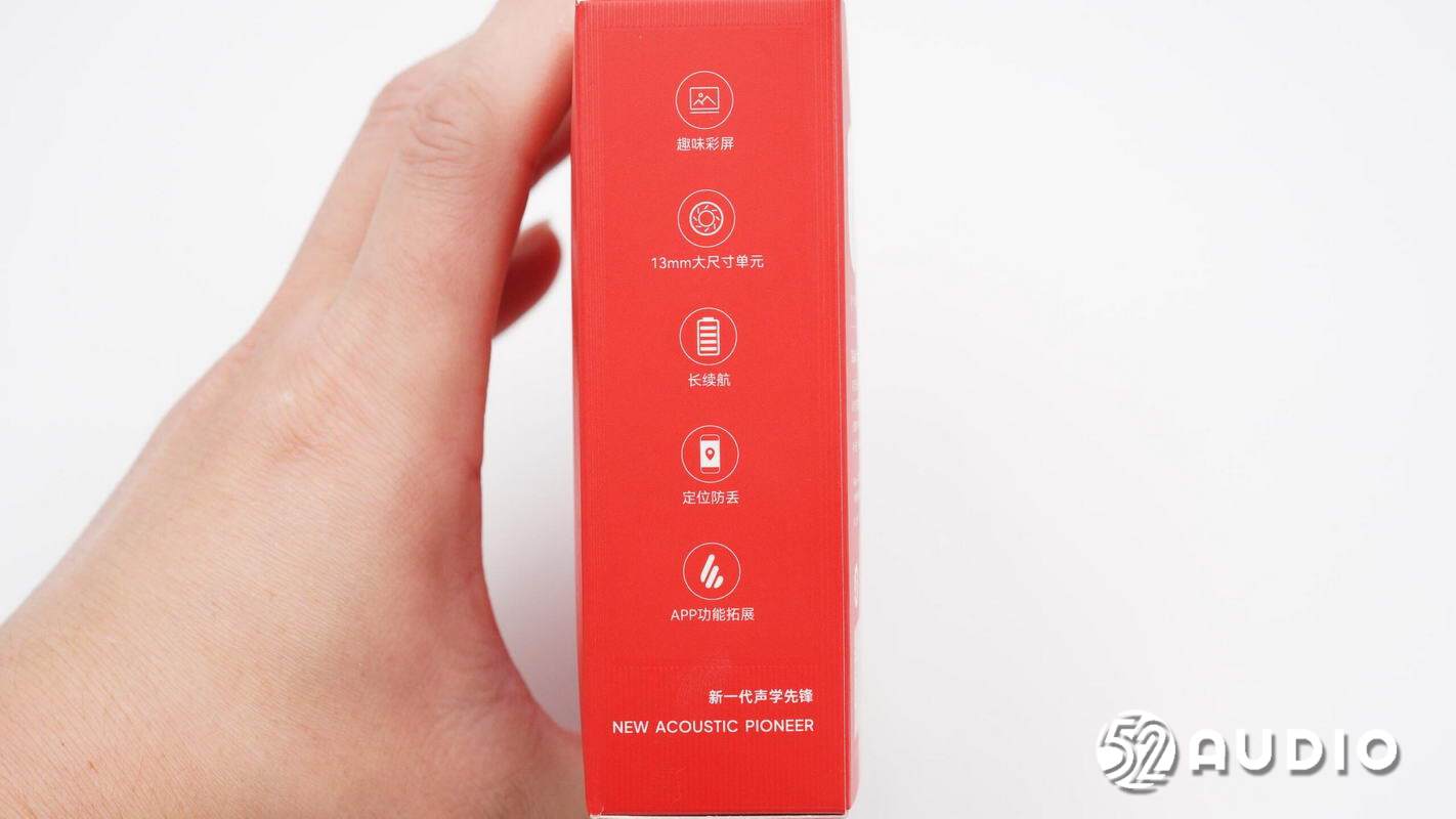 包装盒侧边介绍了产品的详细功能特点:趣味彩屏、13mm大尺寸单元、长续航、定位防丢、APP功能拓展。