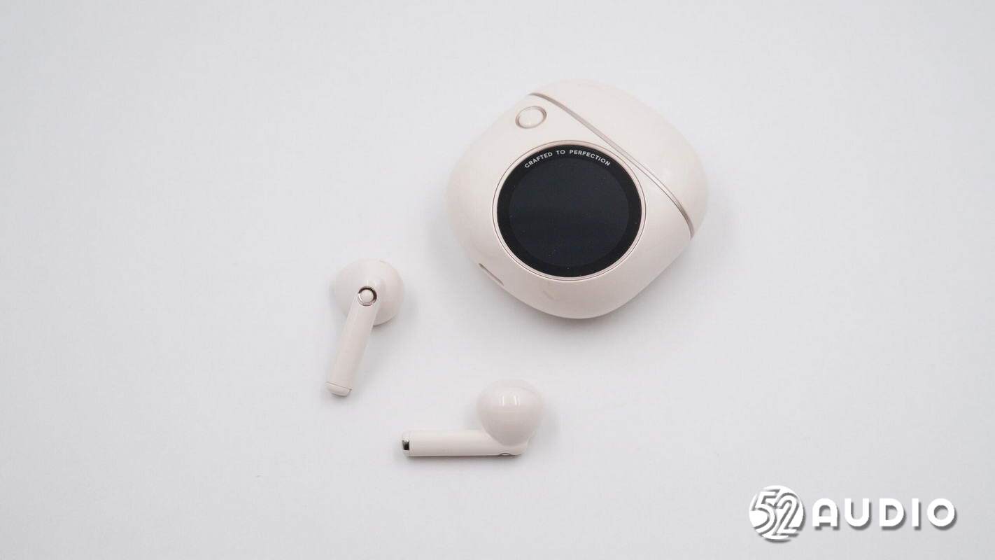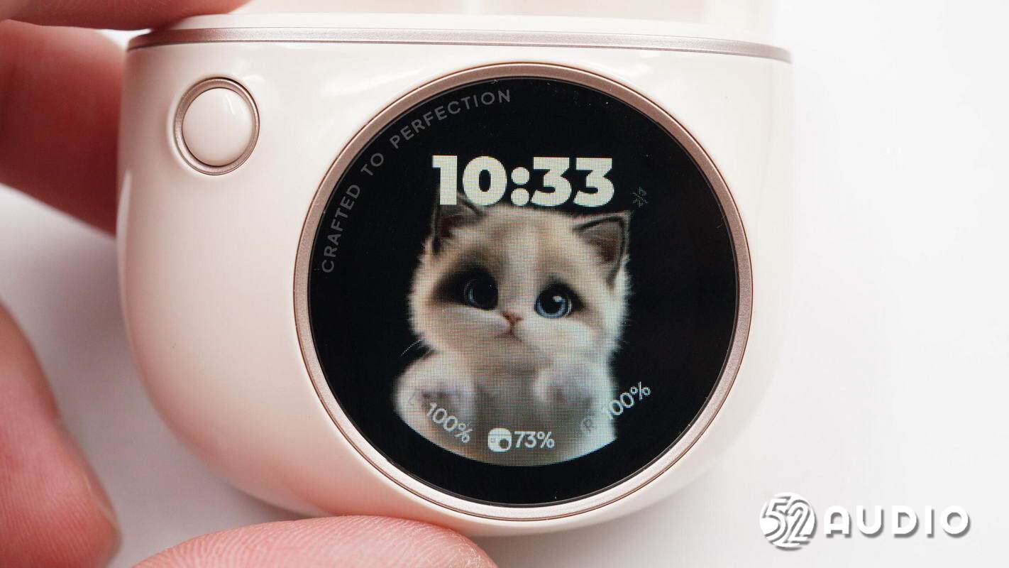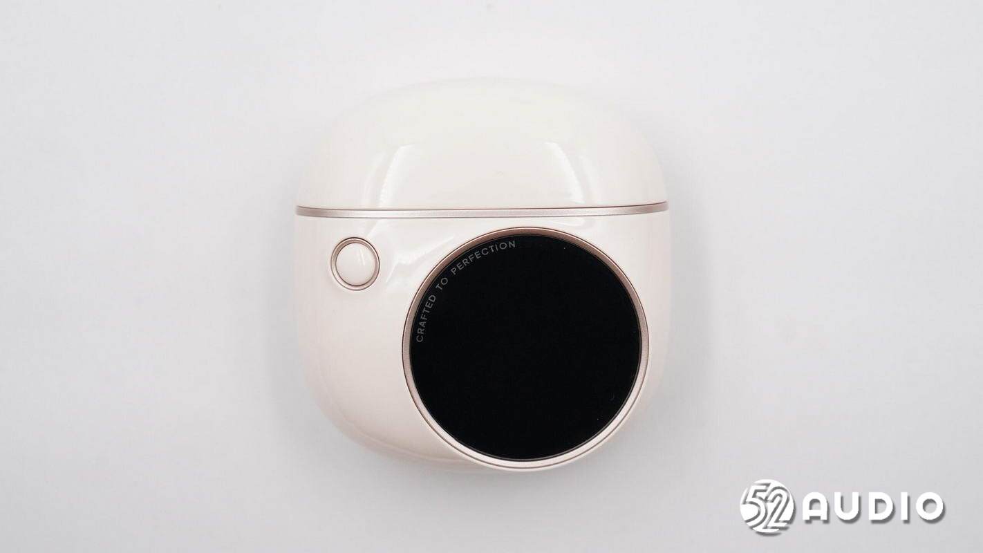 漫步者花再 拍拍耳机充电盒外观设计圆润,体积小巧便携,观感时尚精致。机身正面搭载了圆形彩色显示屏和蓝牙配对功能按键。