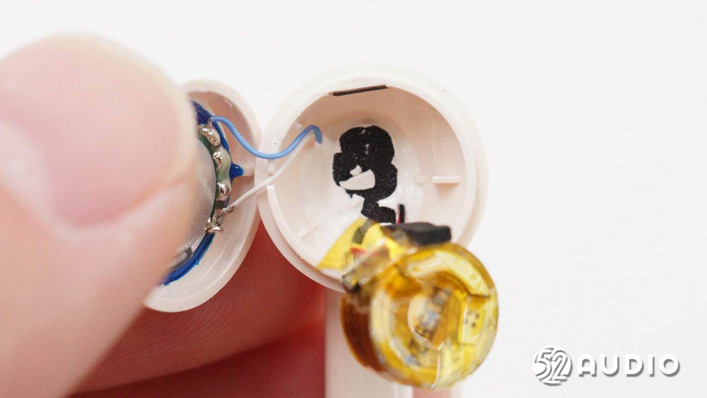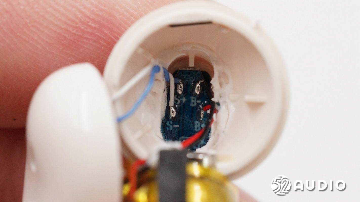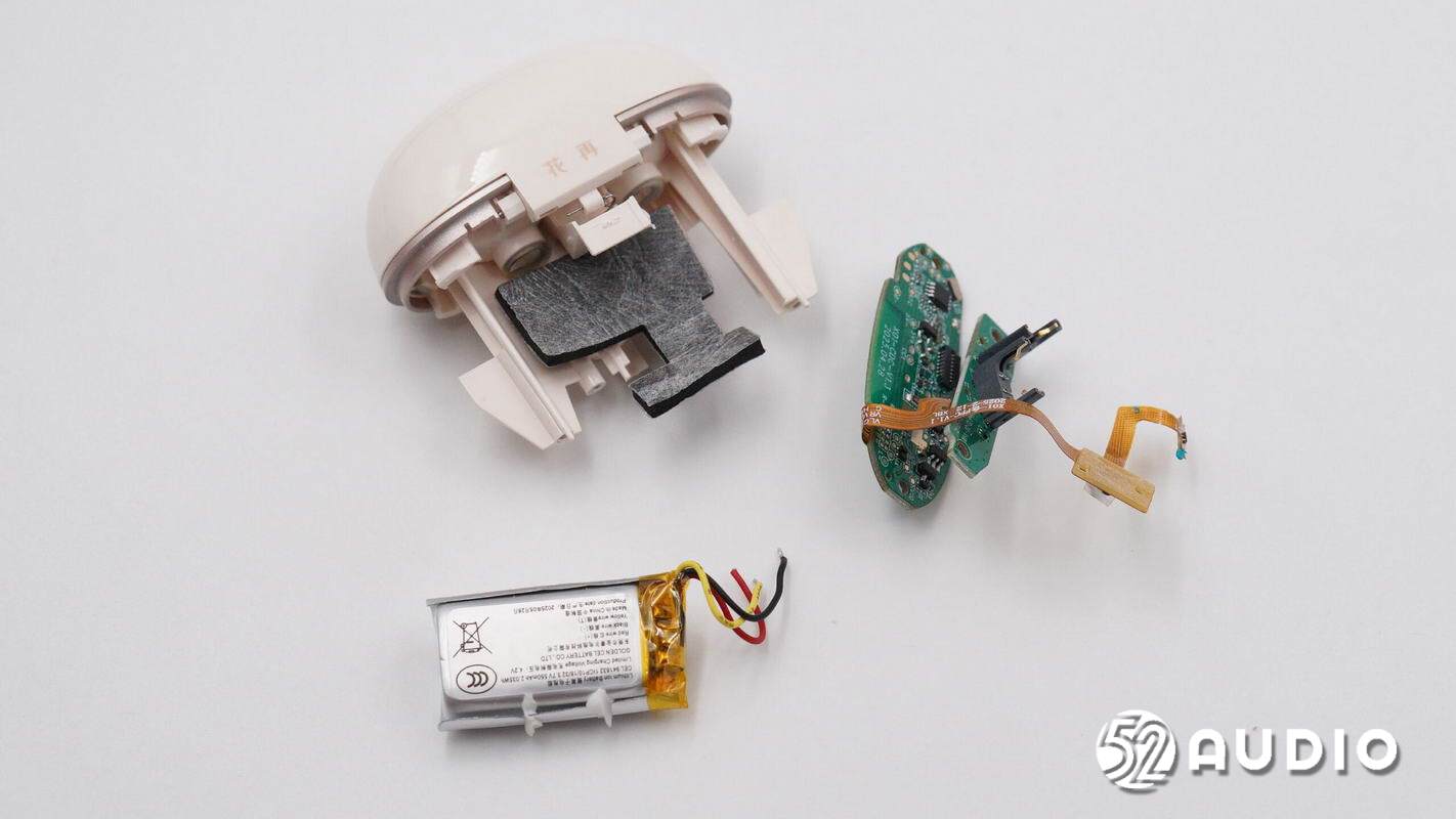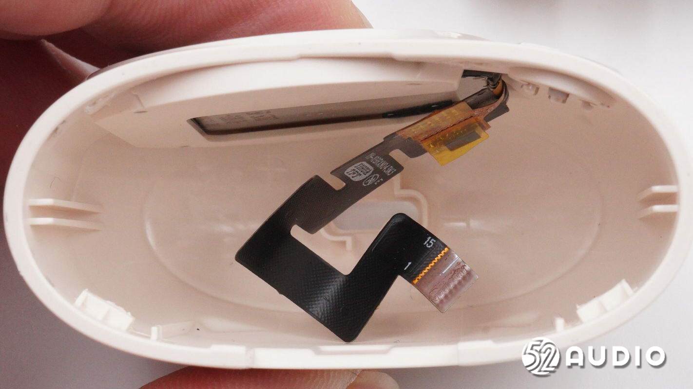取出电池单元,后腔底部设置有海绵垫隔离,导线连接到耳机柄内部主板,打胶密封。
