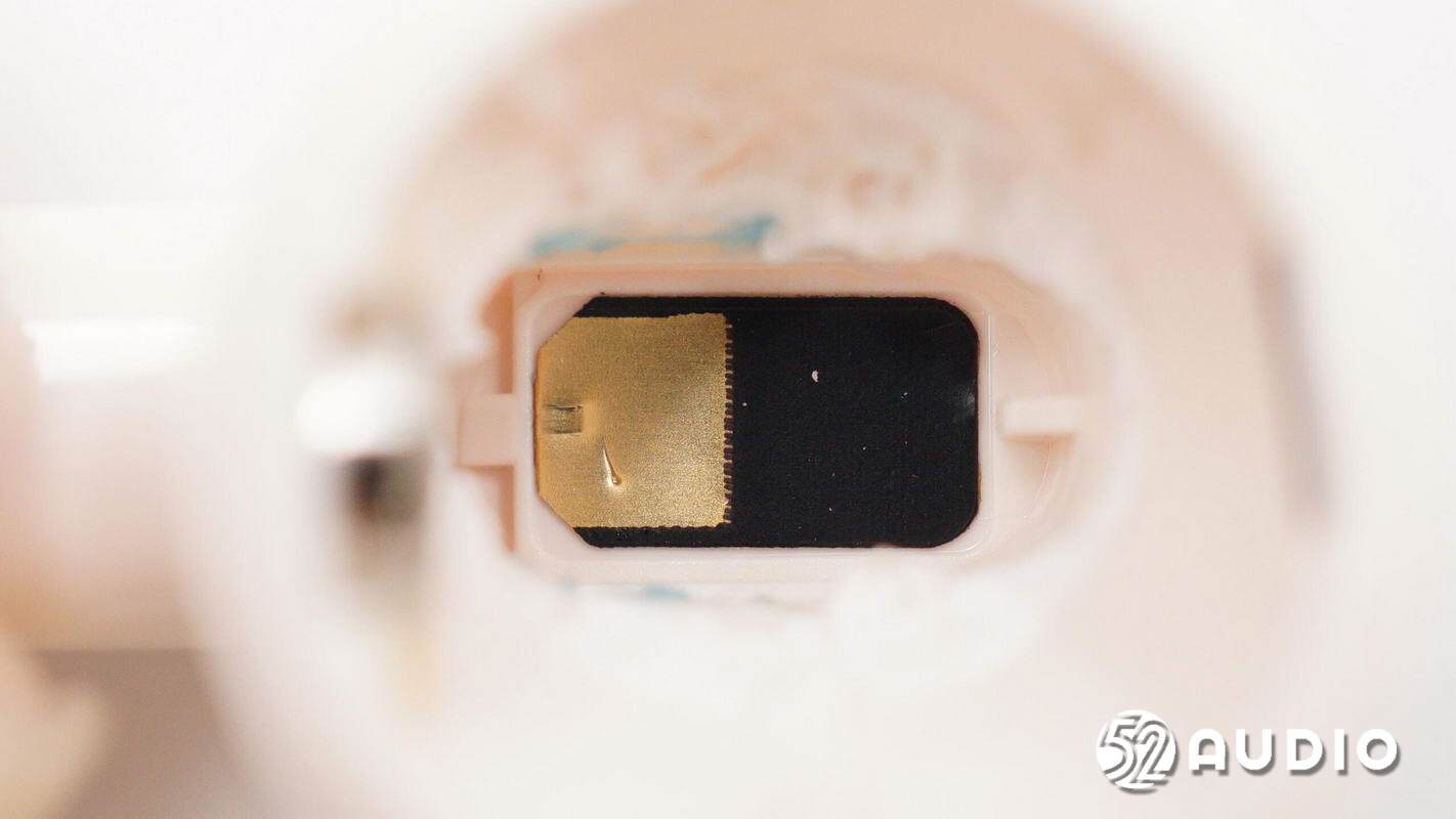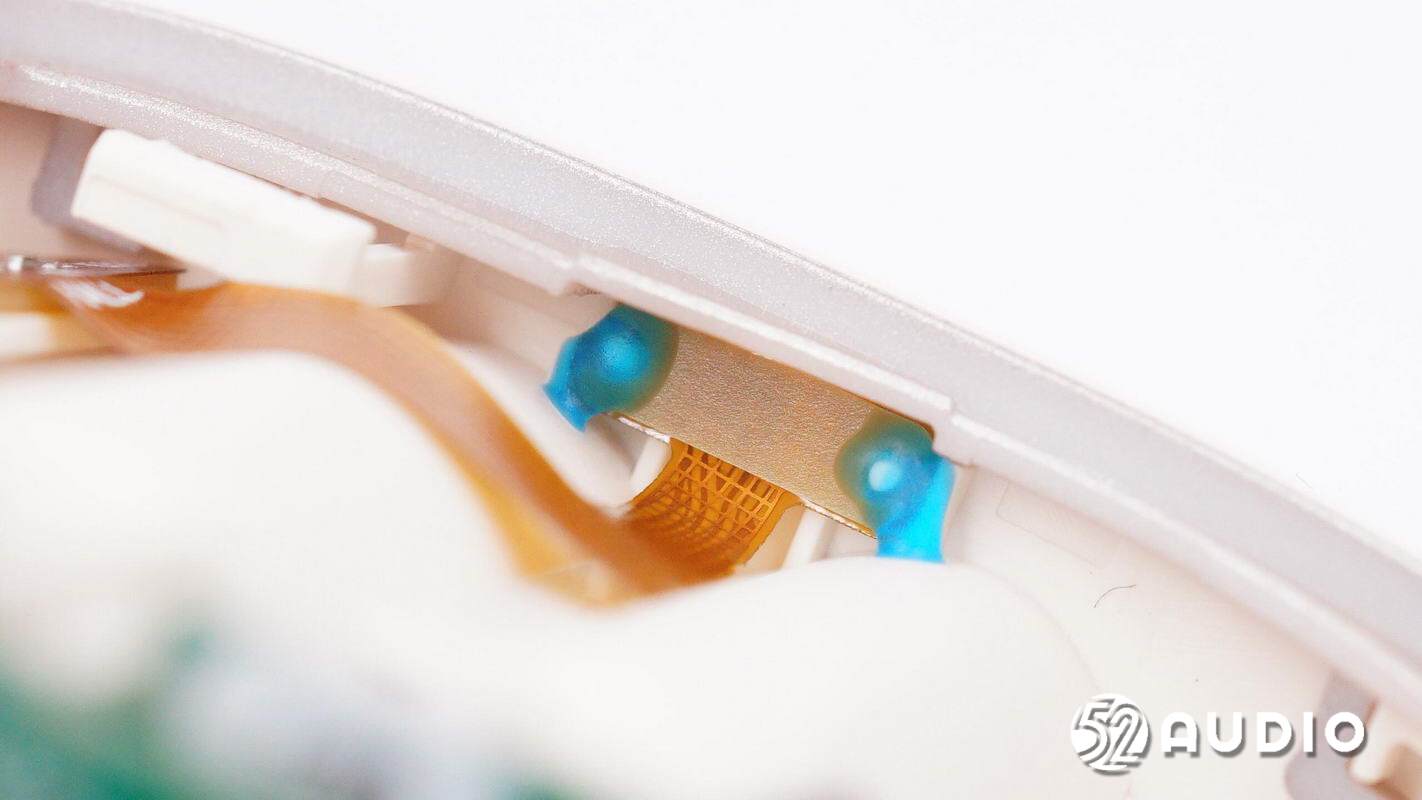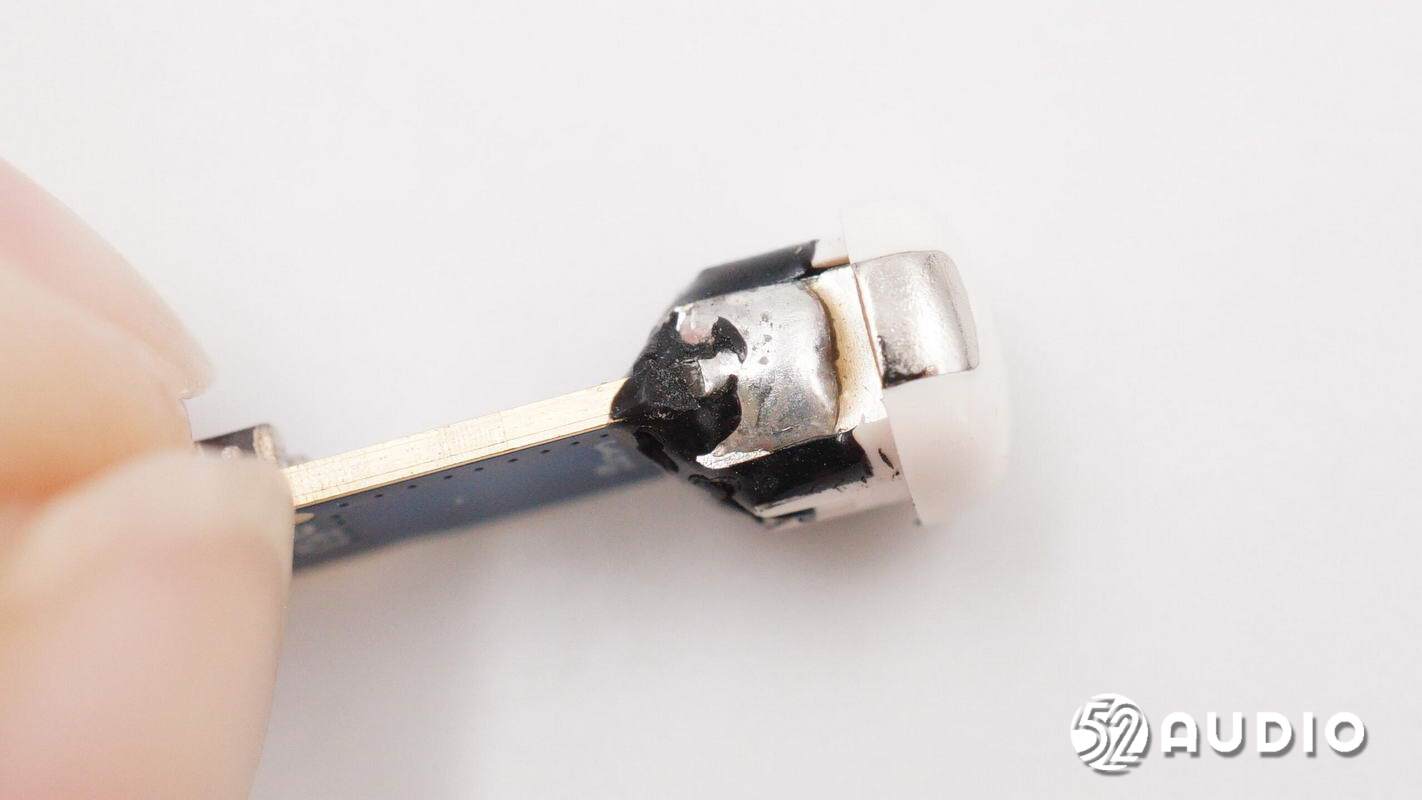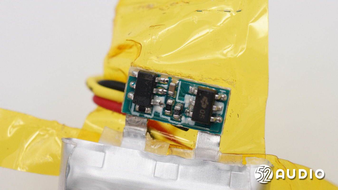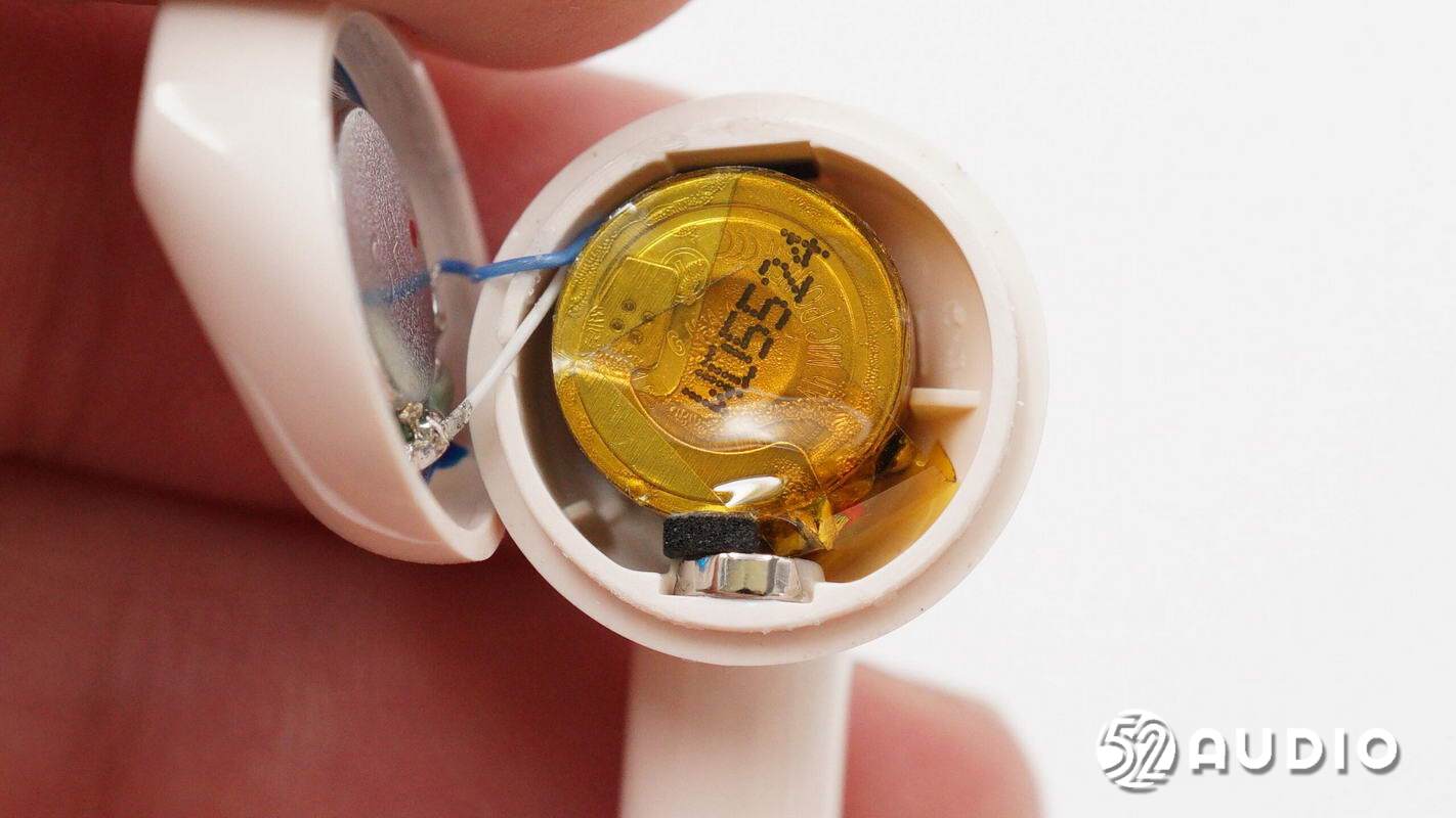 取出电池单元,后腔底部设置有海绵垫隔离,导线连接到耳机柄内部主板,打胶密封。