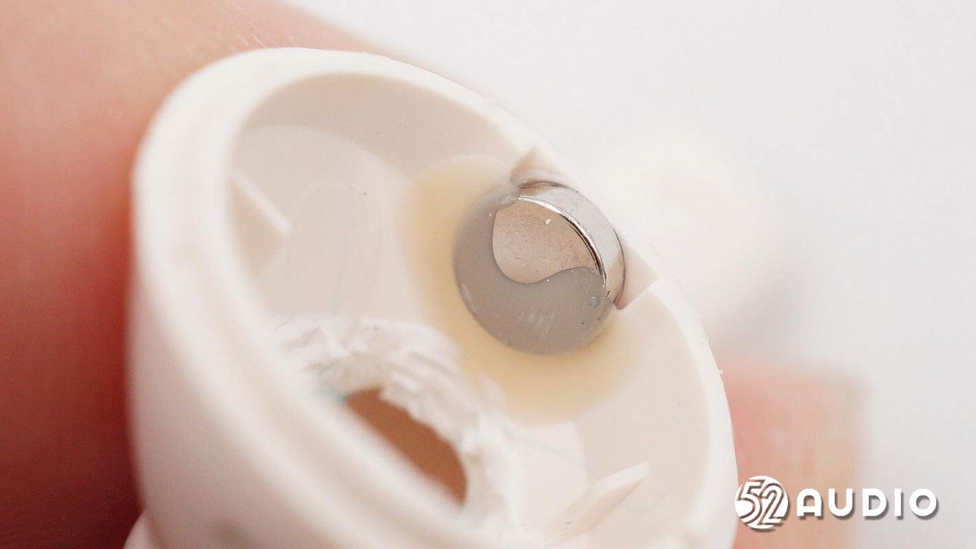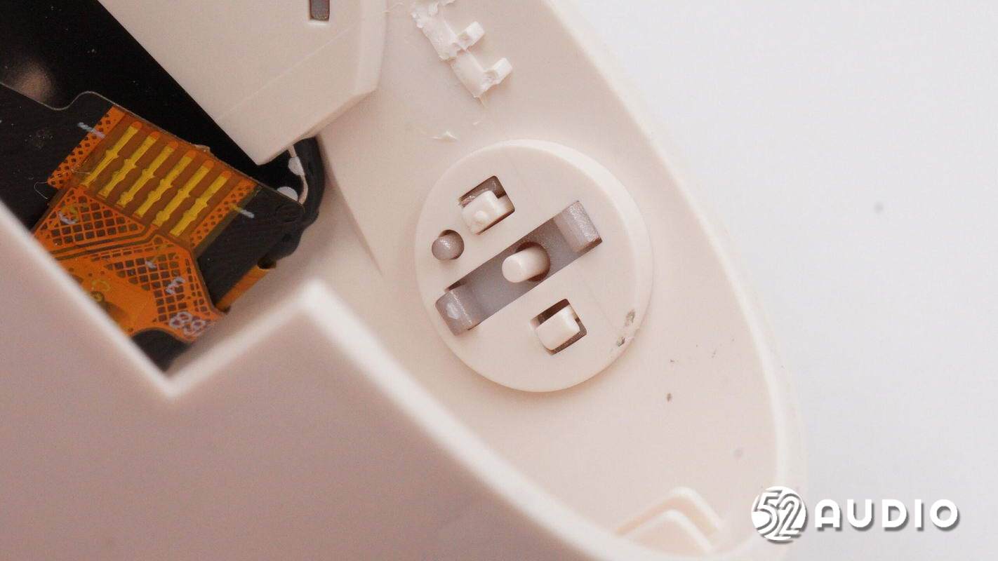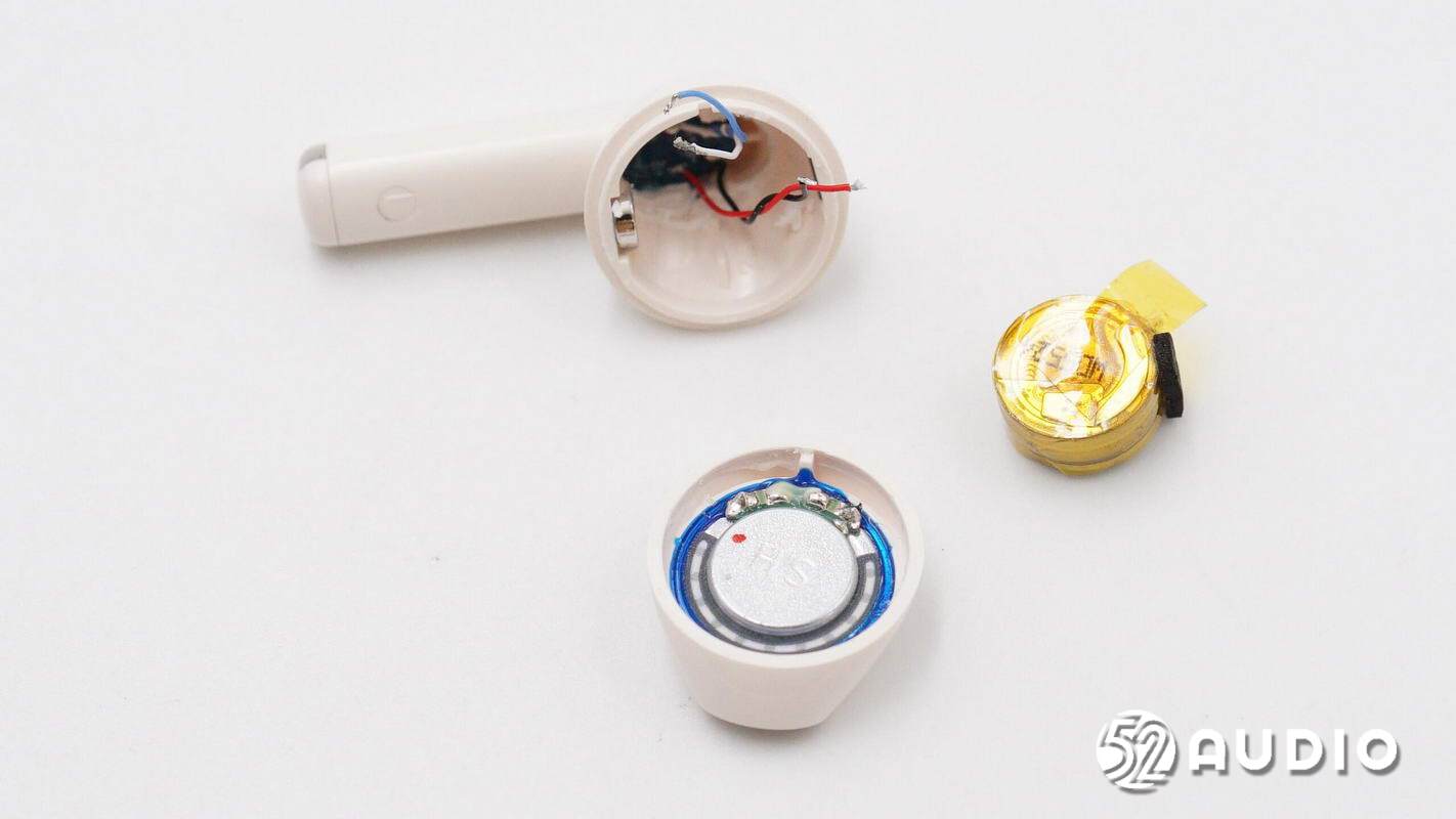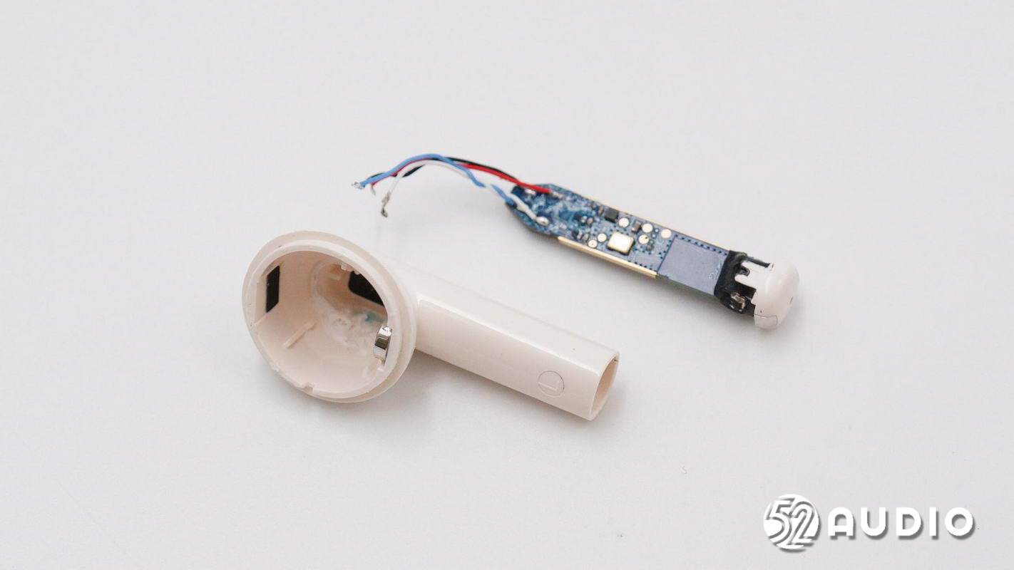 取出电池单元,后腔底部设置有海绵垫隔离,导线连接到耳机柄内部主板,打胶密封。