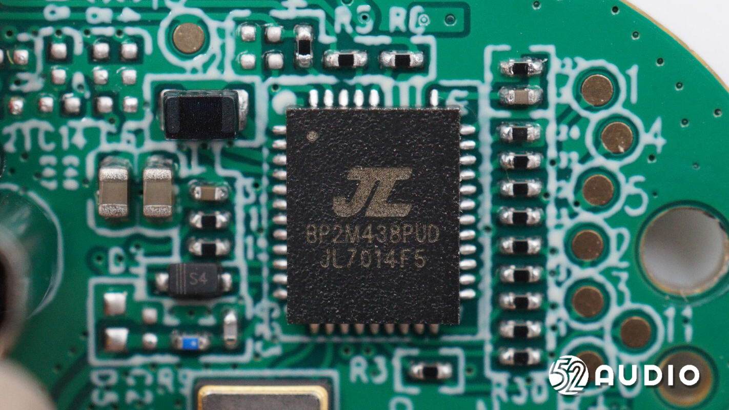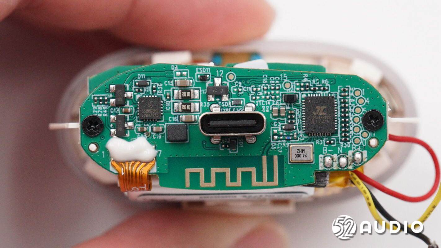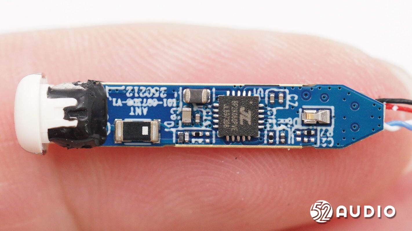 耳机内部搭载了13mm大动圈单元,内置一颗麦克风拾音,采用MIC-POWER微电新能源3.85V/40mAh钢壳扣式电池供电;主板上,搭载了JL杰理科技JL6973D8的蓝牙音频SoC,WINSEMI稳先微WSDF1311C锂电保护IC,Sunlord顺络电子SDCL0603Q系列叠层陶瓷电感等方案。