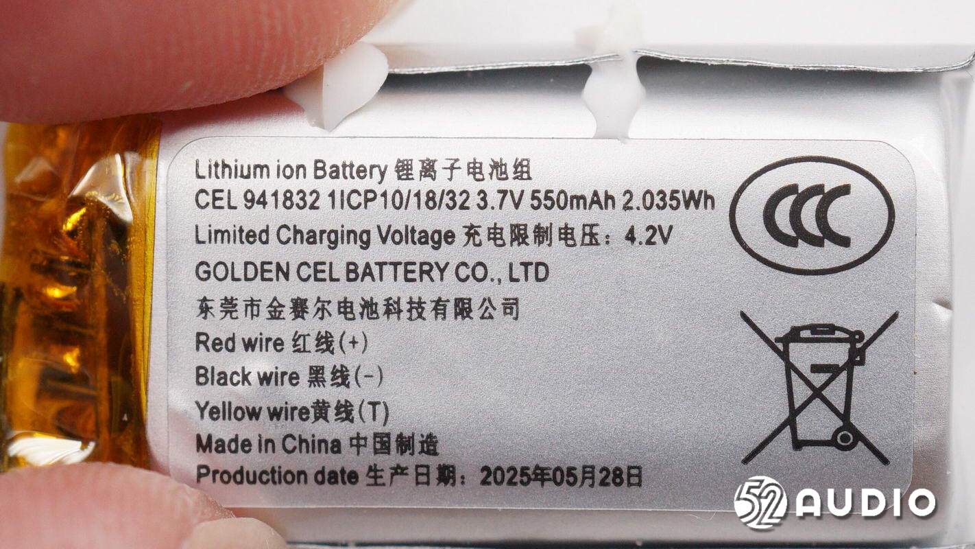 充电盒内置电池标签上信息,锂离子电池组,型号:CEL 941832,电池参数:3.7V 550mAh 2.035Wh,充电限制电压:4.2V,东莞市金赛尔电池科技有限公司。