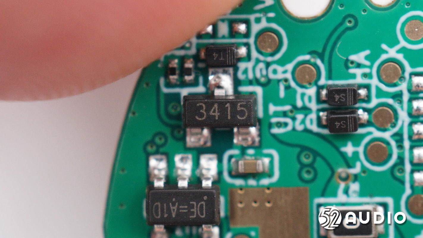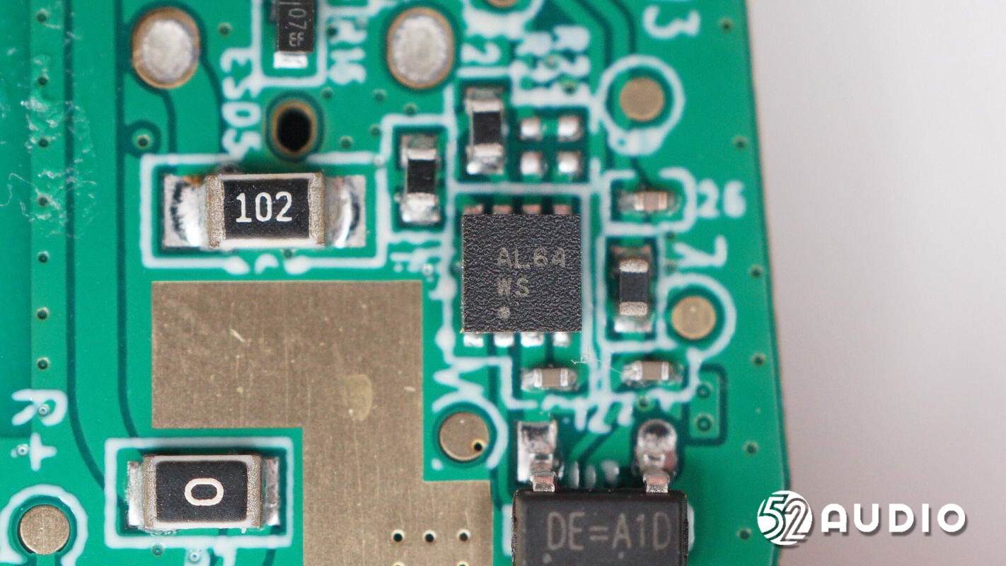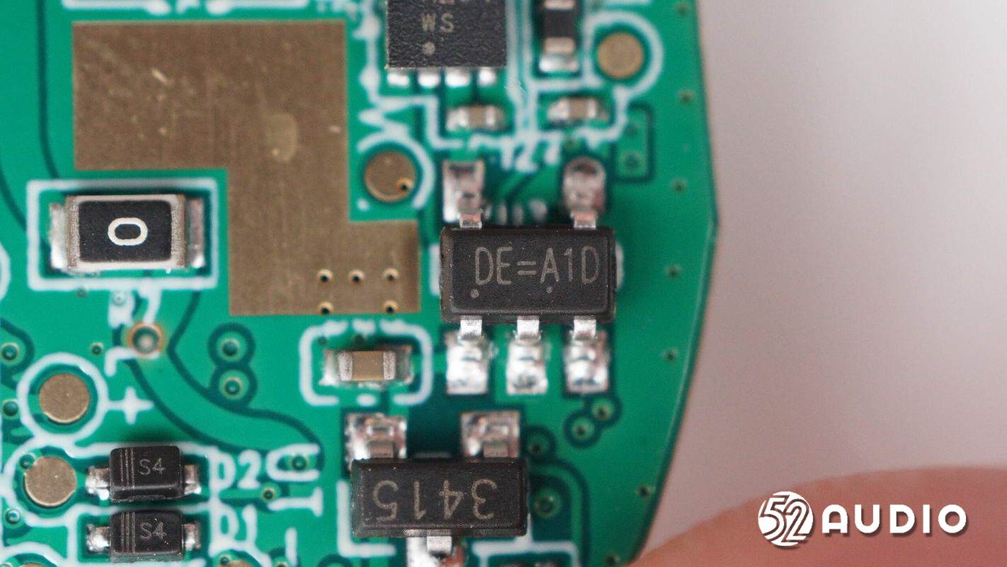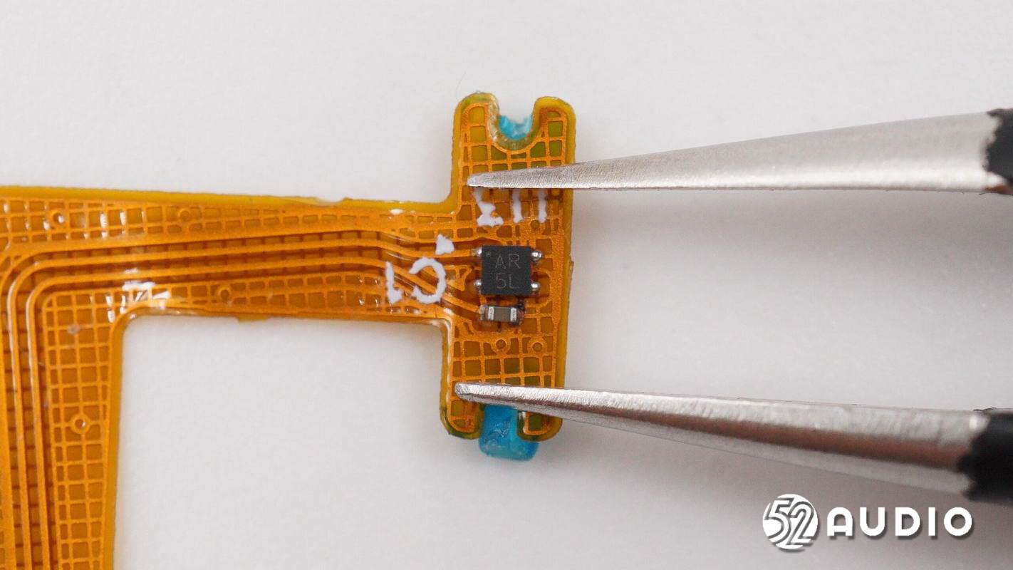 丝印AR 5L的霍尔元件,用于感知充电盒开启/关闭时的磁场变化,进而通知充电盒MCU和耳机与已连接设备配对或断开连接。