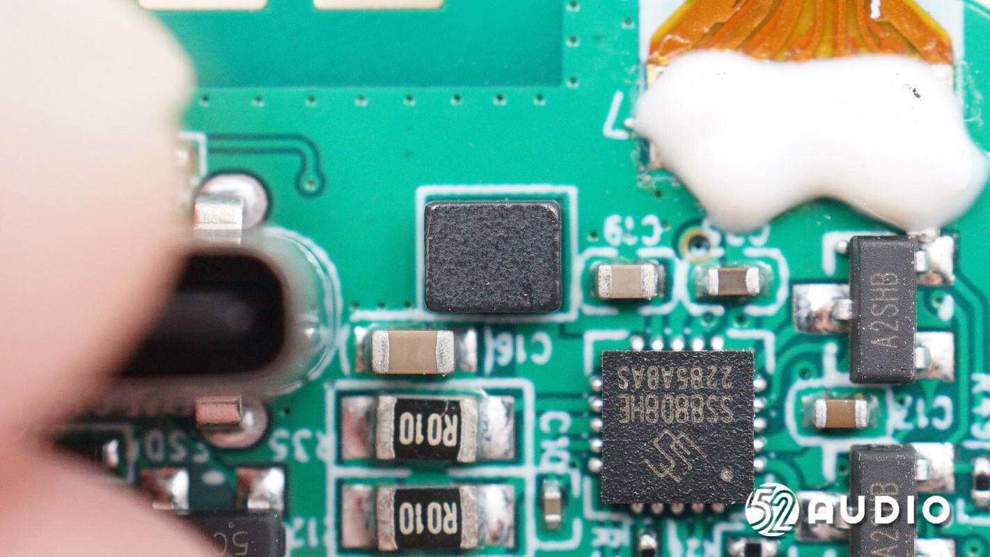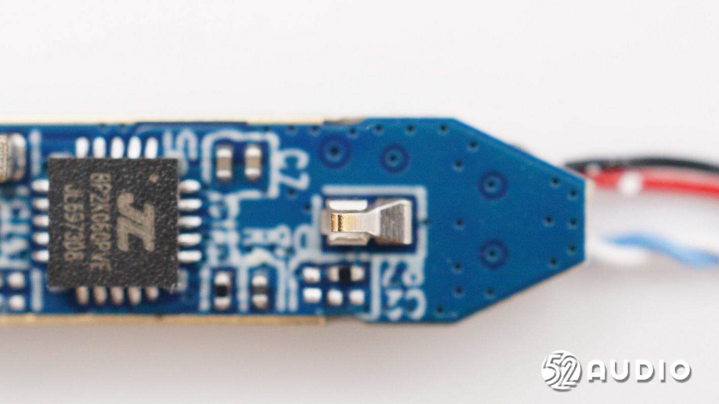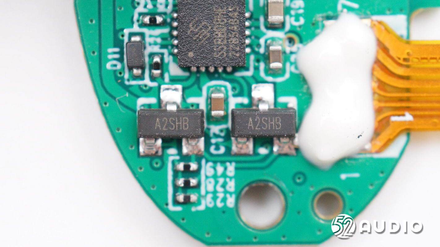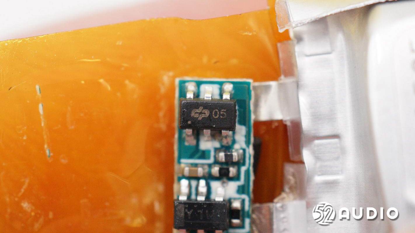 丝印AR 5L的霍尔元件,用于感知充电盒开启/关闭时的磁场变化,进而通知充电盒MCU和耳机与已连接设备配对或断开连接。