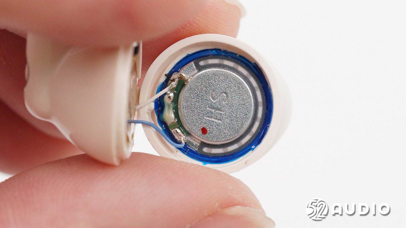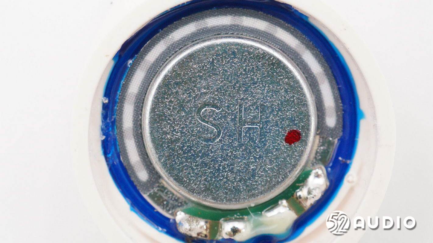 前腔内部扬声器特写,四周设置调音孔,通过丝网防护。