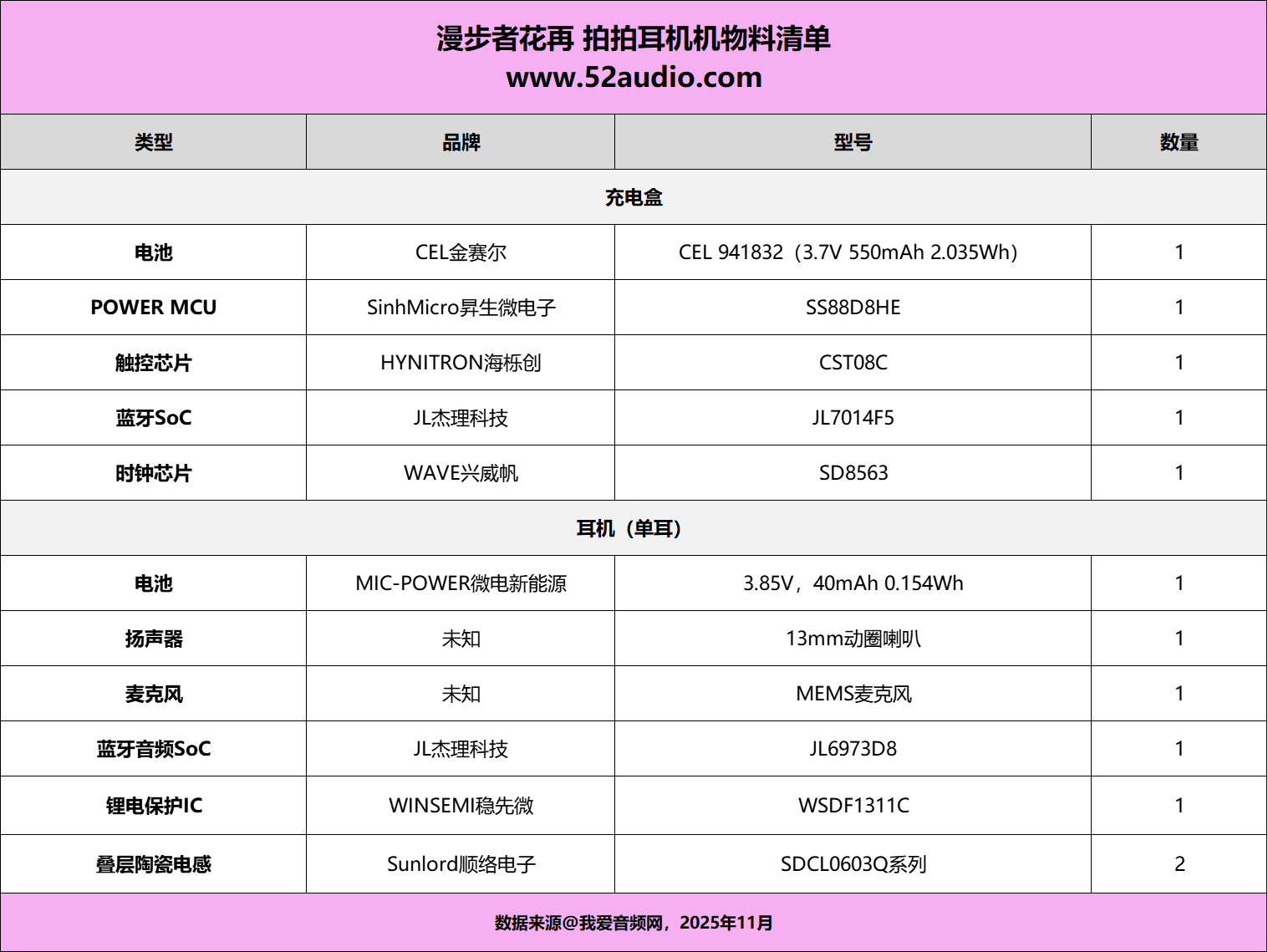 最后附上漫步者花再 拍拍耳机的已知核心物料清单,方便大家查阅。